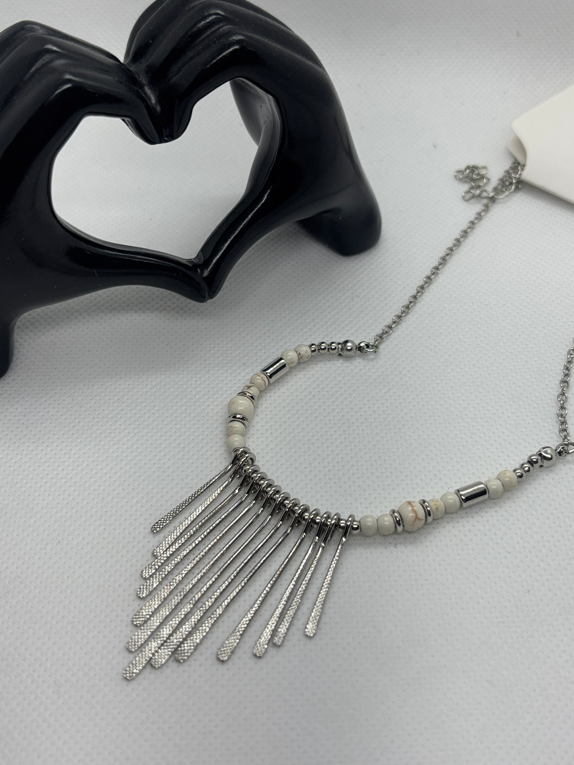 • Pendant detail: Multiple thin, textured silver-toned dangles are suspended from the center, giving it a fringe or waterfall effect.