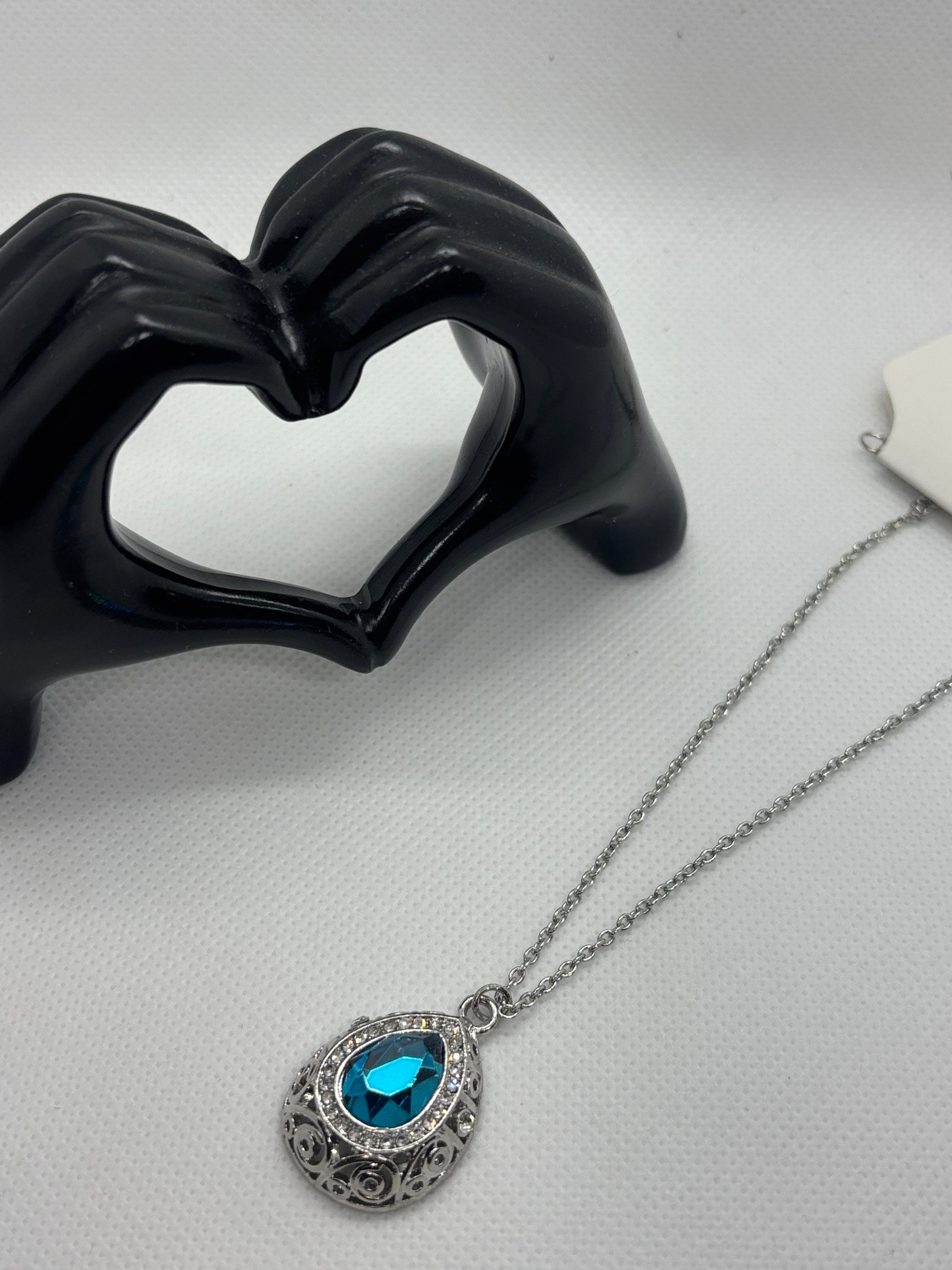 A stainless steel, silver-plated necklace, 19–21 inches in length with a 2-inch extension for adjustable fit. The pendant features a teardrop-shaped design with an intricate filigree outer casing, enclosing a vibrant faceted aqua-blue gem at its center. The gem is encircled by a border of sparkling clear rhinestones, enhancing its brilliance. It hangs from a fine silver chain that complements the ornate pendant.