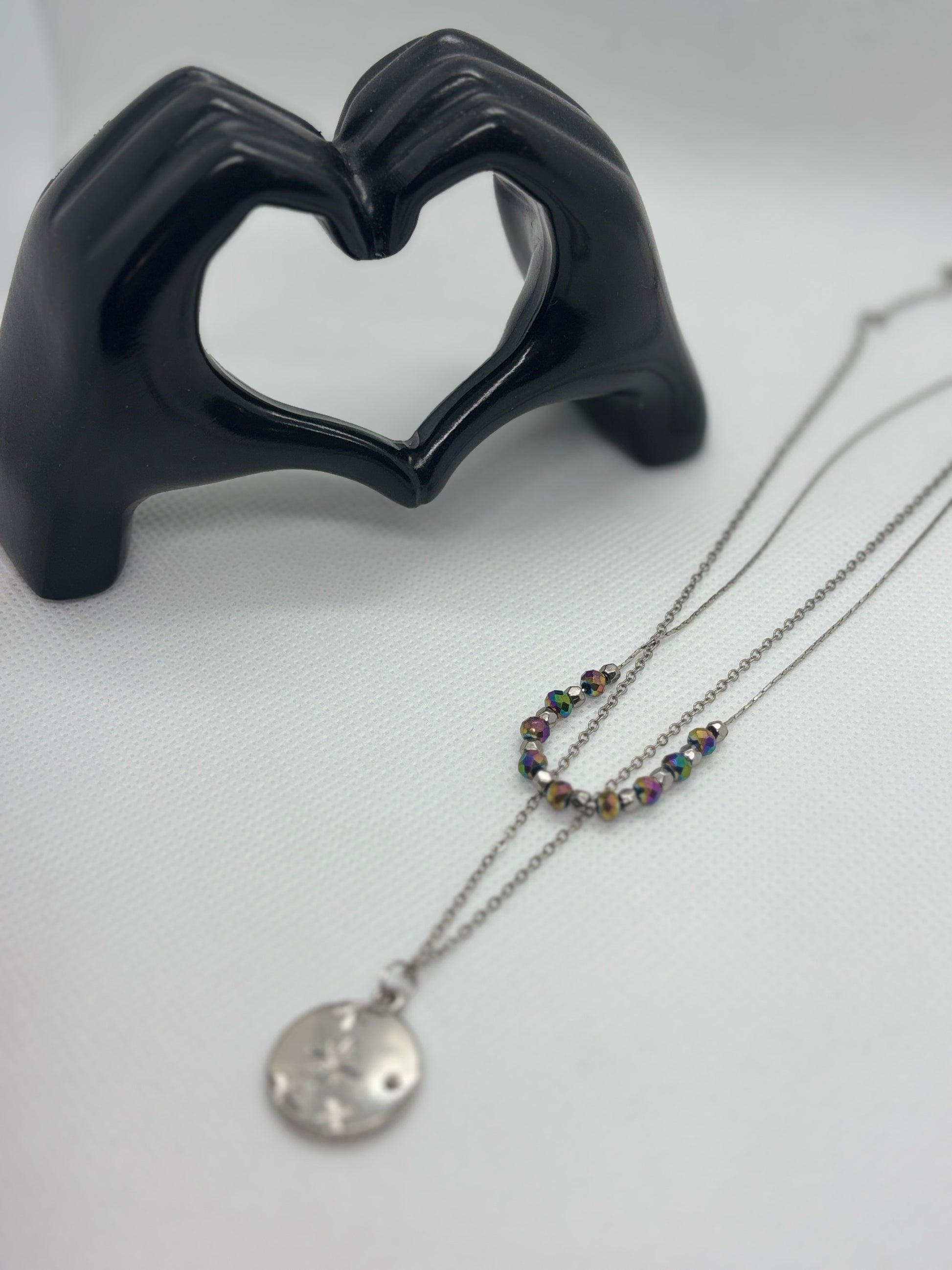 A stainless steel, silver-plated necklace, 19–21 inches long with a 2-inch extension. This layered design features two elegant strands: one adorned with iridescent faceted beads in a rainbow shimmer, and the other holding a round, lightly hammered pendant engraved with tiny celestial motifs like stars and moons. The combination evokes a dreamy, cosmic vibe full of wonder and magic.
