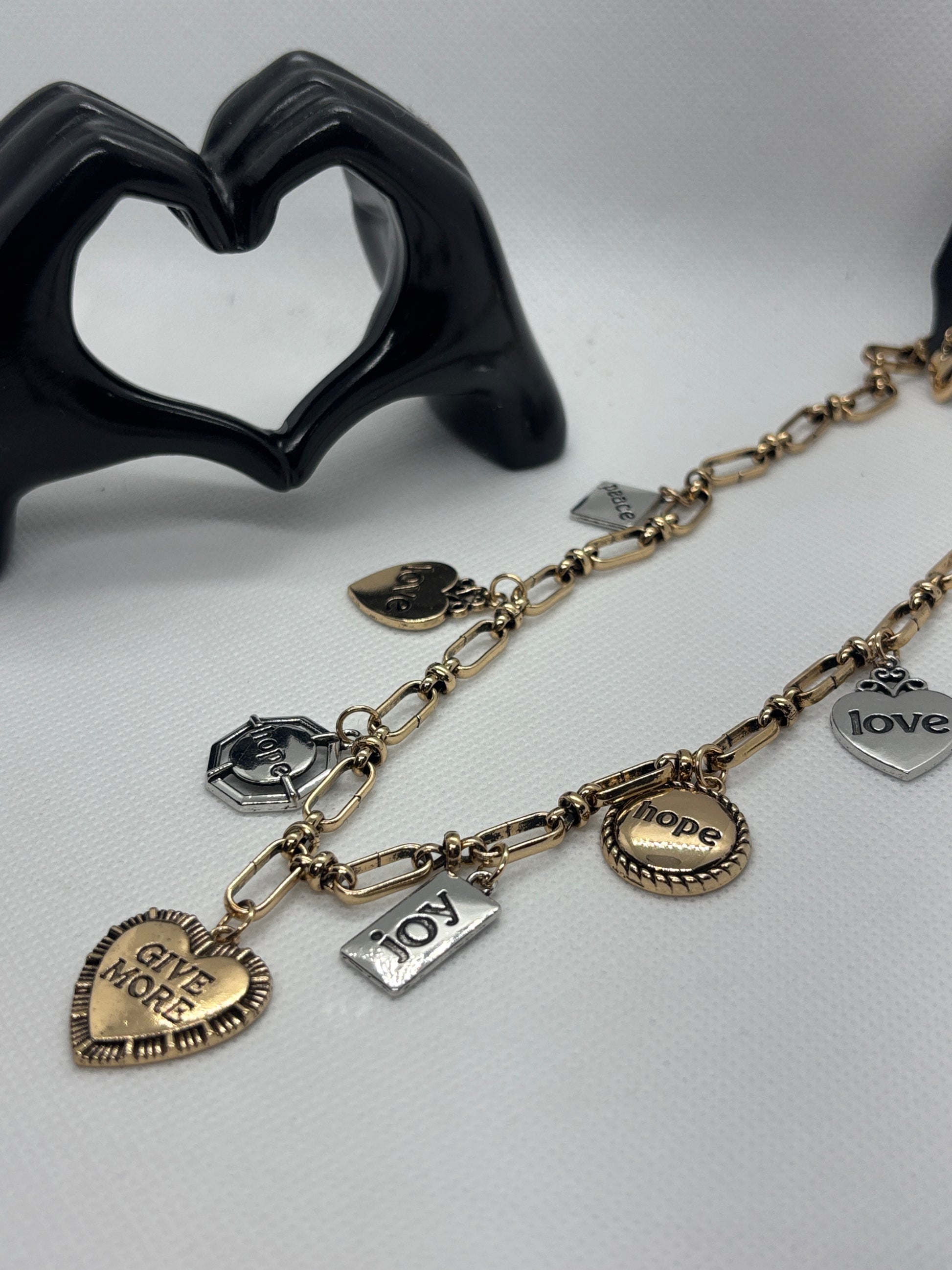 A stainless steel mixed-metal necklace, 19–21 inches long with a 2-inch extension. This meaningful piece features a chunky chain design in gold and silver tones, adorned with an assortment of engraved charms. Each charm carries a powerful message—love, joy, hope, peace, and give more—making it both stylish and deeply symbolic.