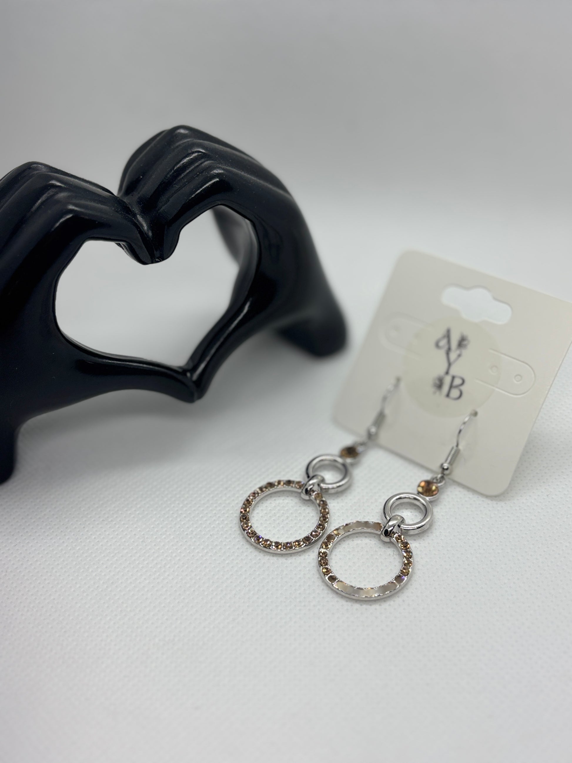 Add a touch of refined sparkle with the Champagne Glimmer Drops. These elegant dangle earrings feature a polished silver-tone hoop accented with shimmering champagne-hued rhinestones that catch the light beautifully. Suspended from a sleek double-ring design with a matching bead at the top, they strike the perfect balance between timeless simplicity and modern glam. Ideal for special occasions or adding subtle shine to your everyday look.