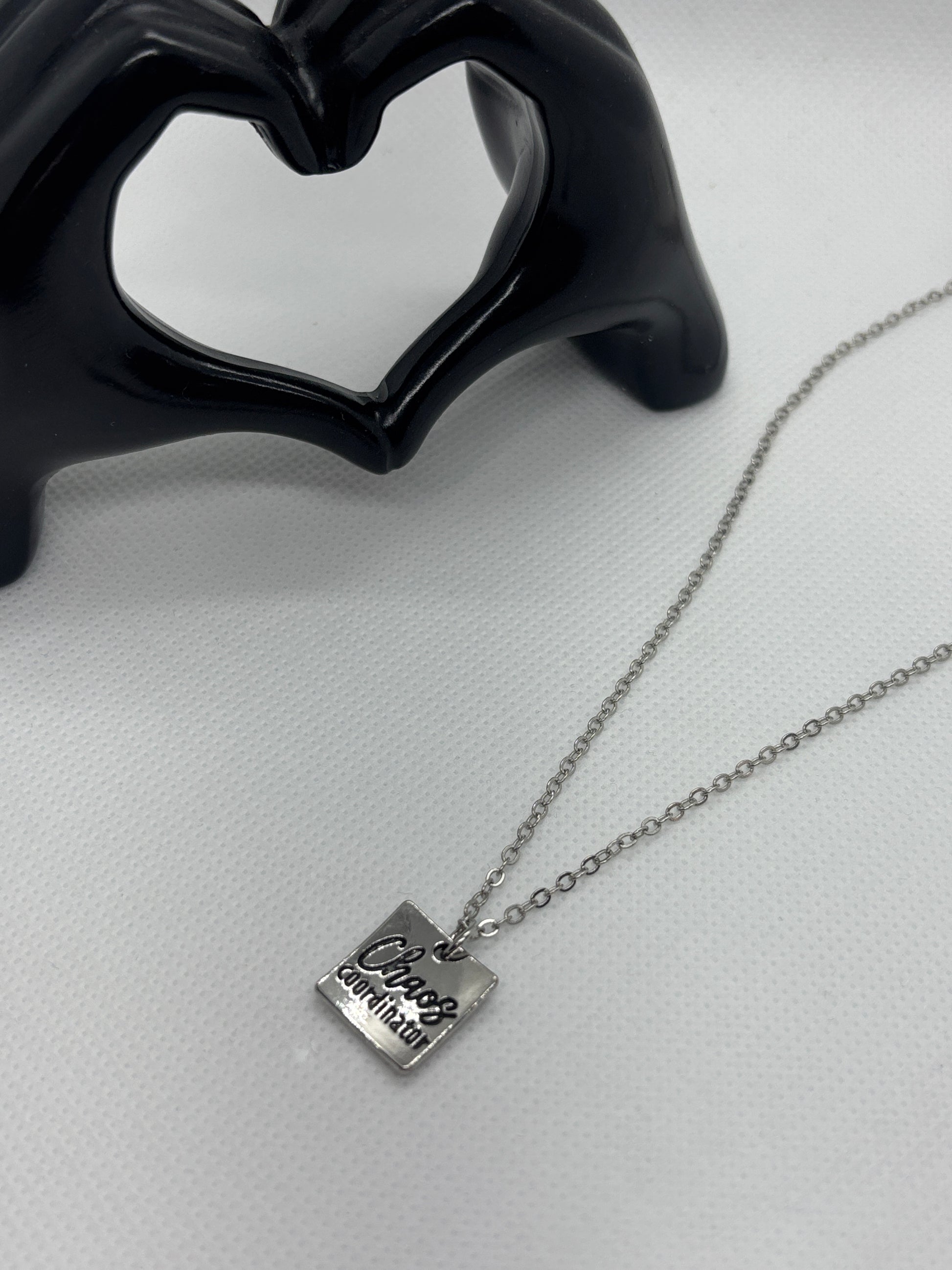 A stainless steel, silver-plated necklace, 19–21 inches in length with a 2-inch extension. It features a minimalist delicate chain paired with a square pendant engraved with the bold, playful phrase “Chaos Coordinator” in a mix of cursive and block lettering. The polished silver finish gives it a clean, modern look while the message adds a touch of humor and relatability.