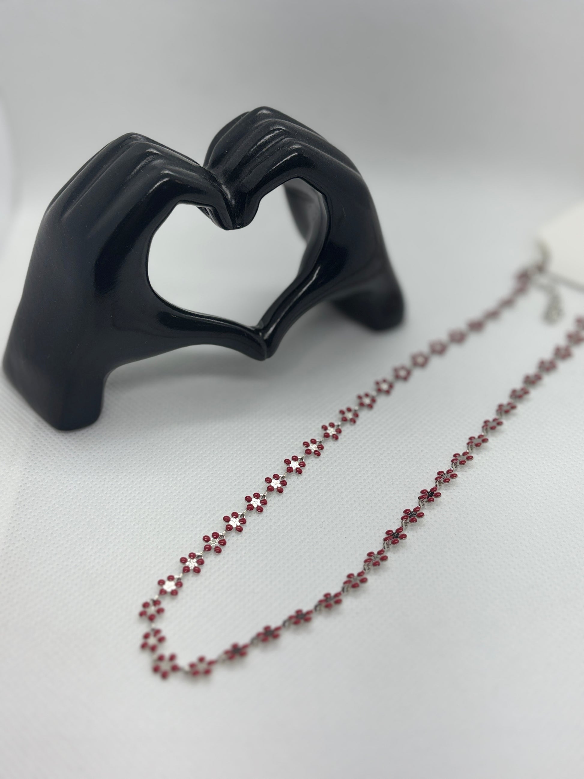 A stainless steel, silver-plated necklace, 19–21 inches in length with a 2-inch extension. The entire length is adorned with tiny red enamel flowers, each with a silver center, creating a continuous garland-like pattern. The petite flower design gives it a sweet, whimsical charm while maintaining a lightweight and comfortable fit.