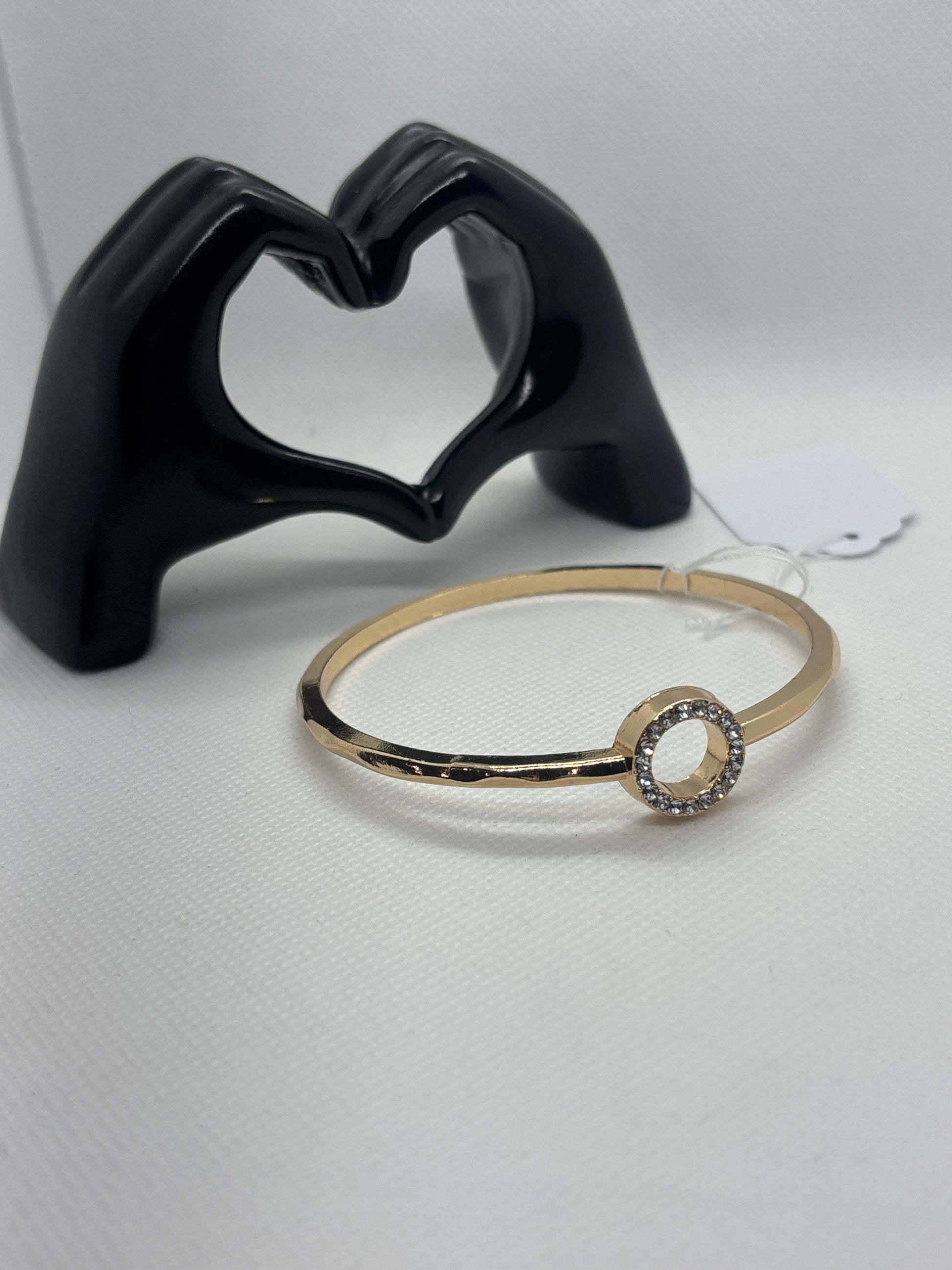 Sleek, stylish, and subtly symbolic—the Circle of Light Bangle is an elegant reminder of wholeness and continuity. This polished gold-toned bracelet features a minimalist band accented by a single open circle, encrusted with shimmering clear stones for just the right touch of sparkle.