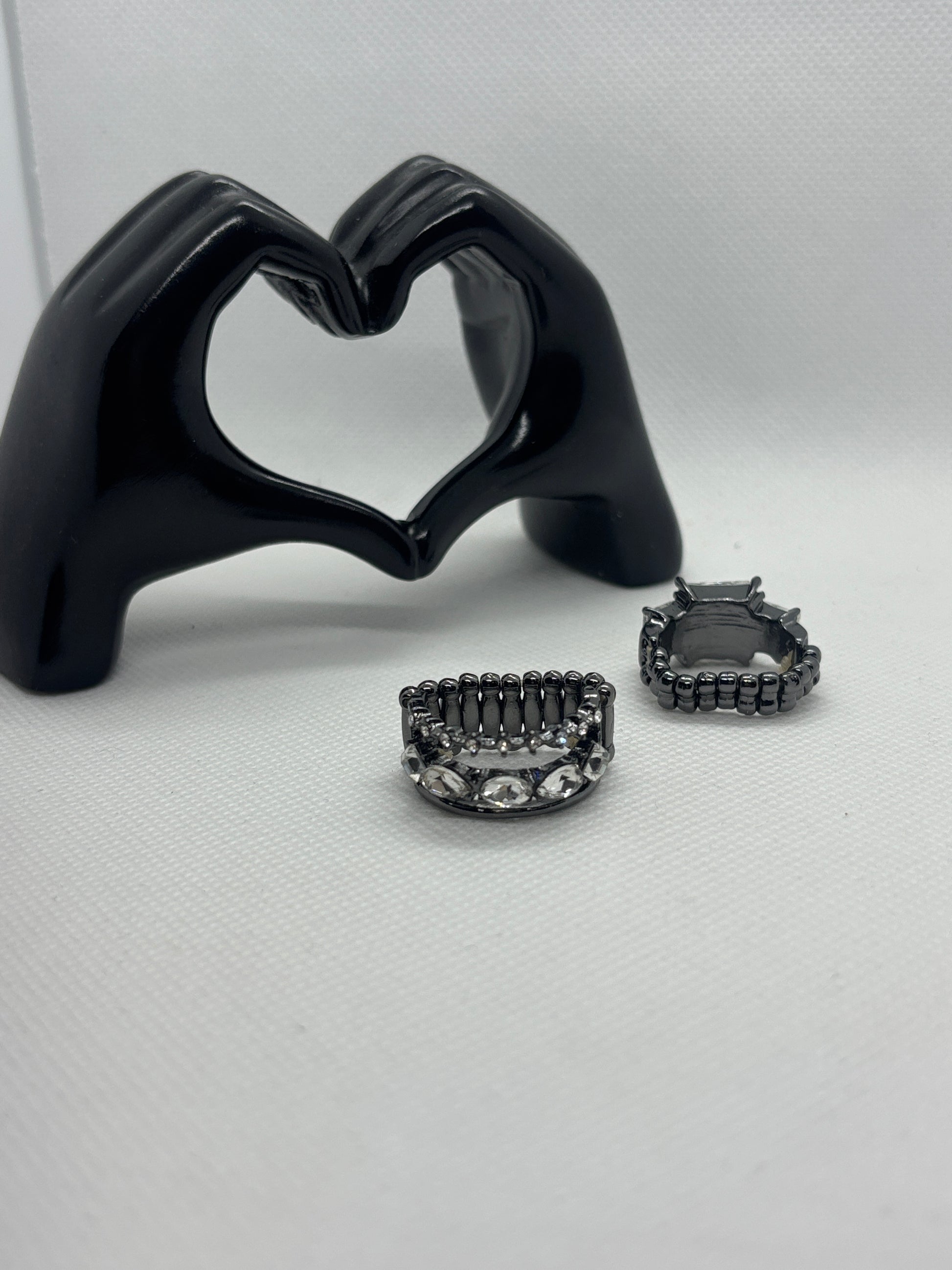 The Crystal Crown ring is a regal beauty designed to shine with confidence. Set in a glossy gunmetal finish, its band is adorned with a row of clear, crown-cut crystals that radiate elegance and power. The subtle arc of sparkle mimics the look of a tiara, adding a queenly touch to your everyday or special-occasion style.