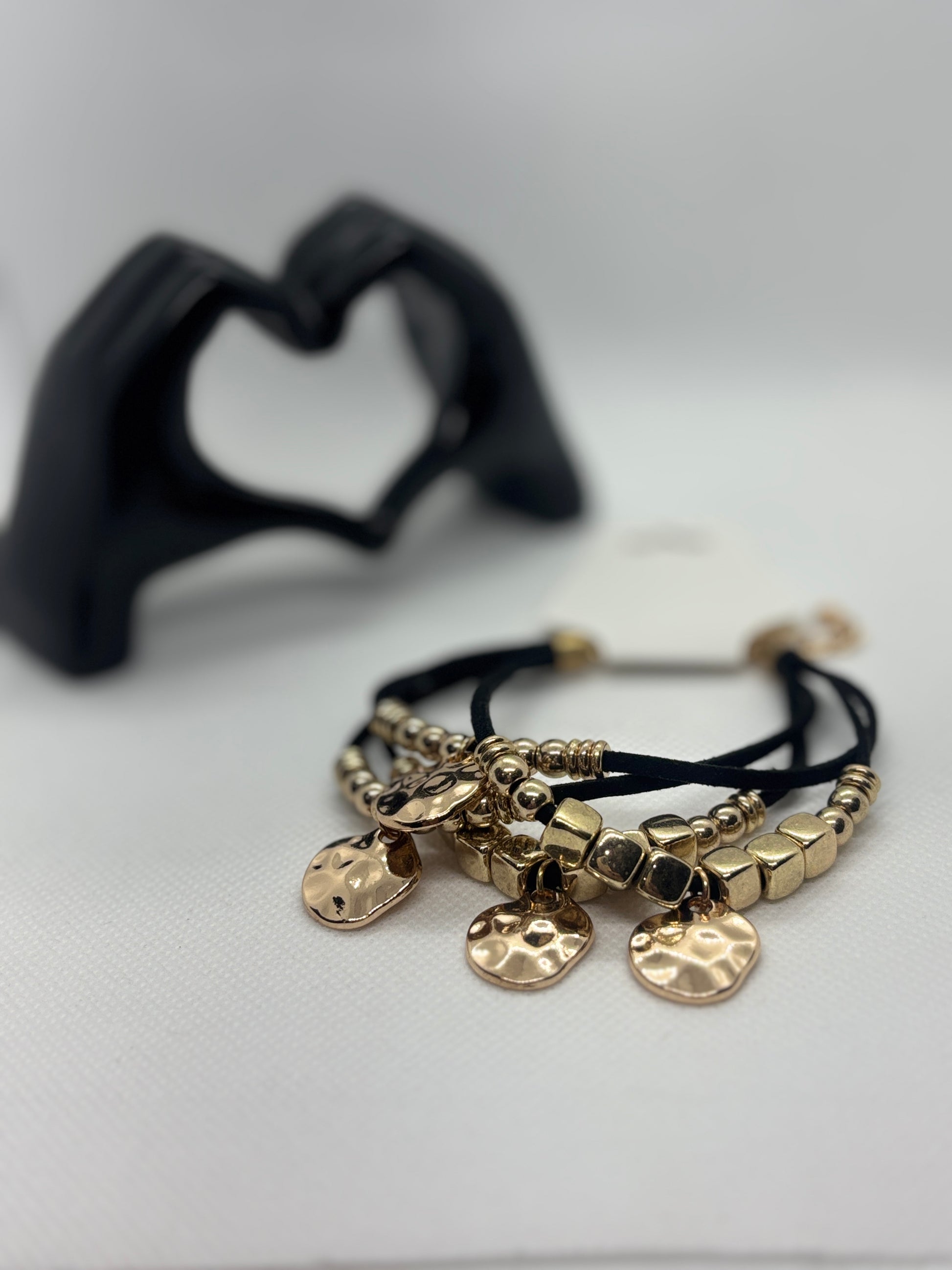 Add a boho-chic beat to your look with the Golden Rhythm Charm Bracelet Set. Featuring soft black cords adorned with polished gold-tone beads, this set brings texture and shine together effortlessly. Each bracelet is accented with hammered disc charms that shimmer with organic appeal, giving your stack a rhythmic, carefree vibe.