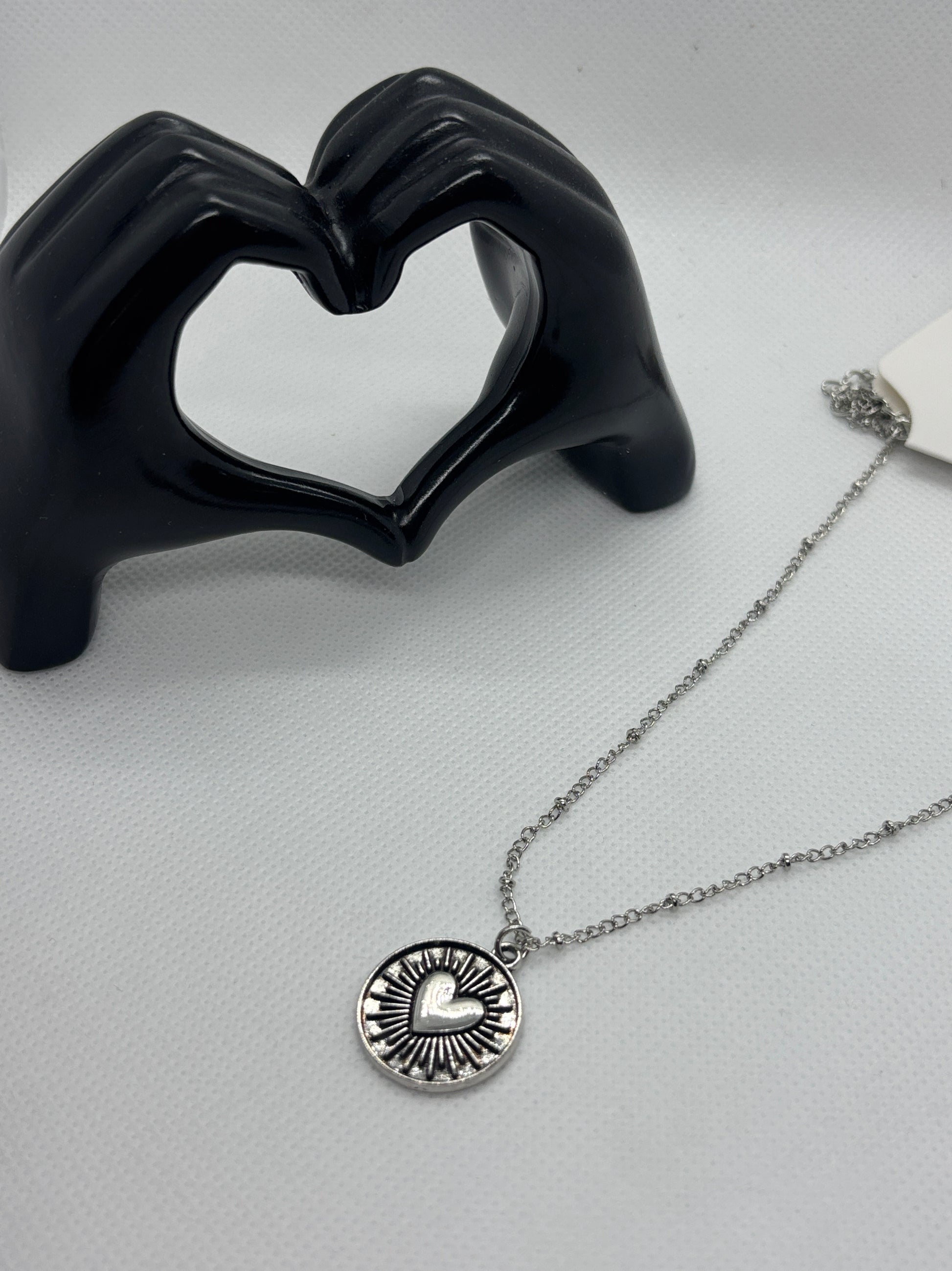 A stainless steel, silver-plated necklace, 19–21 inches in length with a 2-inch extension for flexible wear. The pendant is a round medallion charm featuring a raised heart at the center, surrounded by engraved radiating sunbeam lines, symbolizing warmth, love, and positivity. The fine silver-toned chain keeps the focus on the beautifully textured charm.
