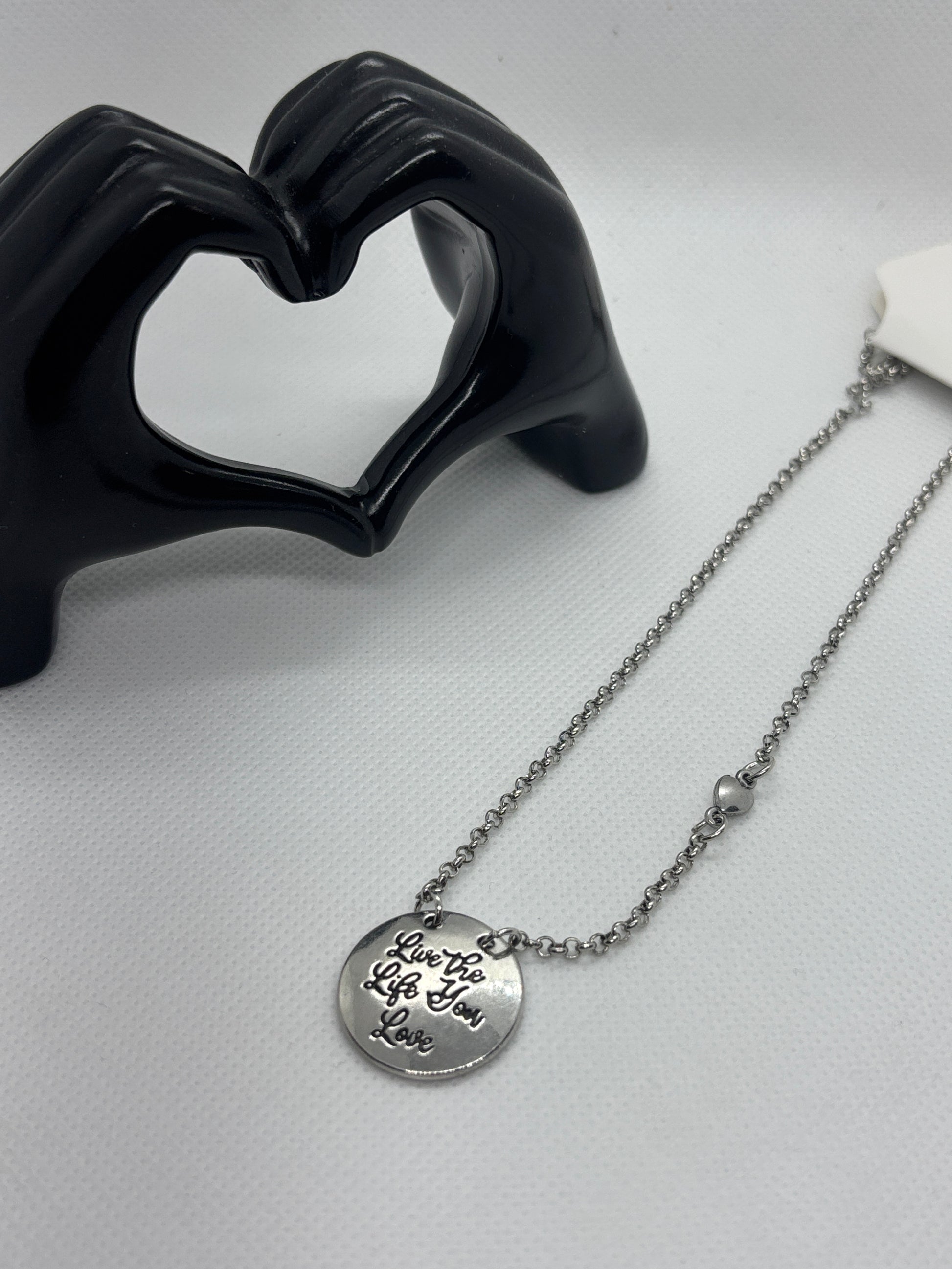“Live the Life You Love” in elegant, script-style lettering. The chain is classic and dainty, with a sweet tiny heart accent integrated near the clasp, adding an extra touch of love and detail.