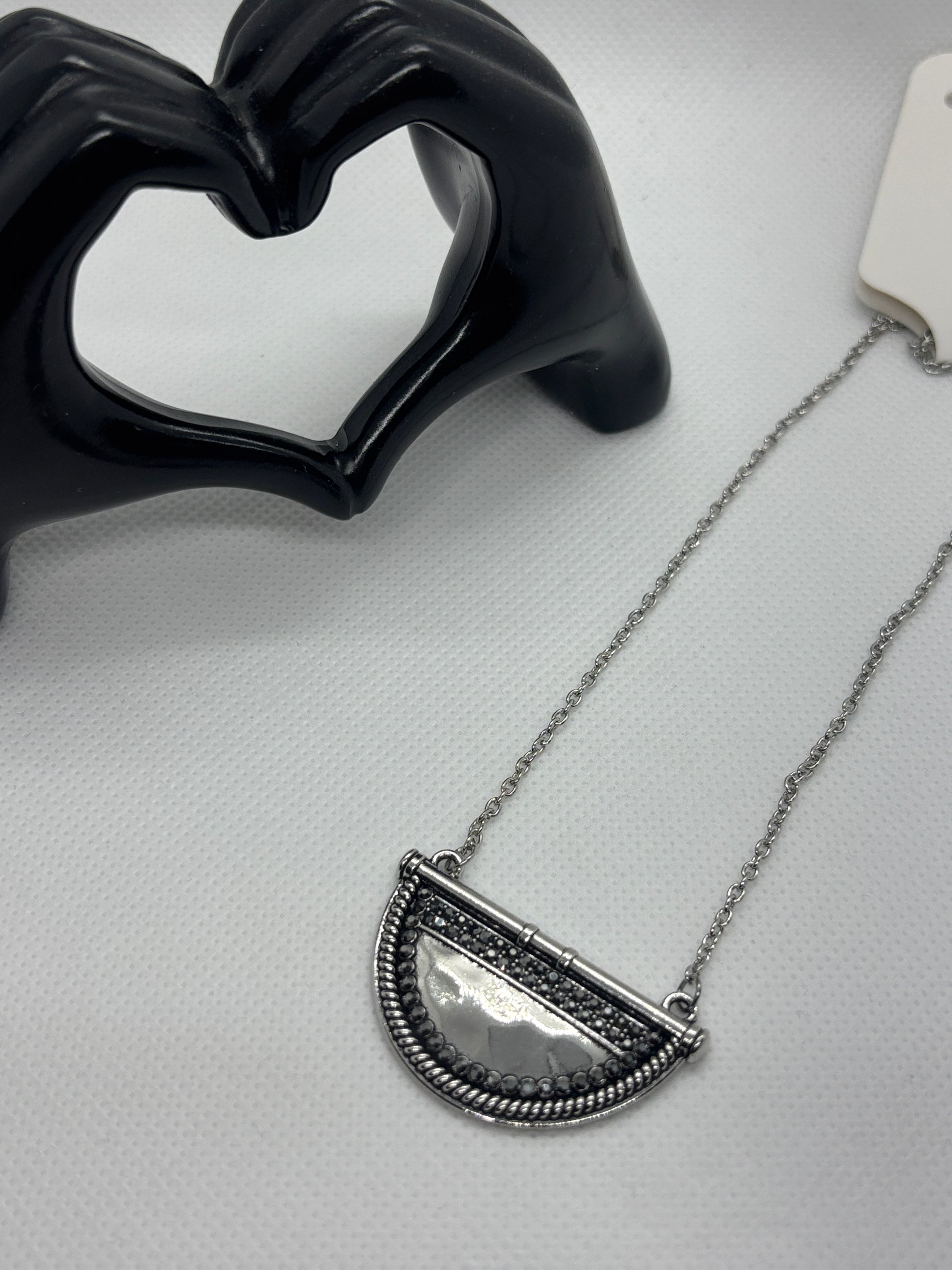 A stainless steel, silver-plated necklace, 19–21 inches long with a 2-inch extension. The pendant is a striking half-moon shape featuring a hammered metal center framed by detailed textured rope and beadwork accents. The mix of smooth and intricate textures creates a balanced, eye-catching look. Suspended from a delicate chain, this pendant rests flat for a flattering neckline accent.