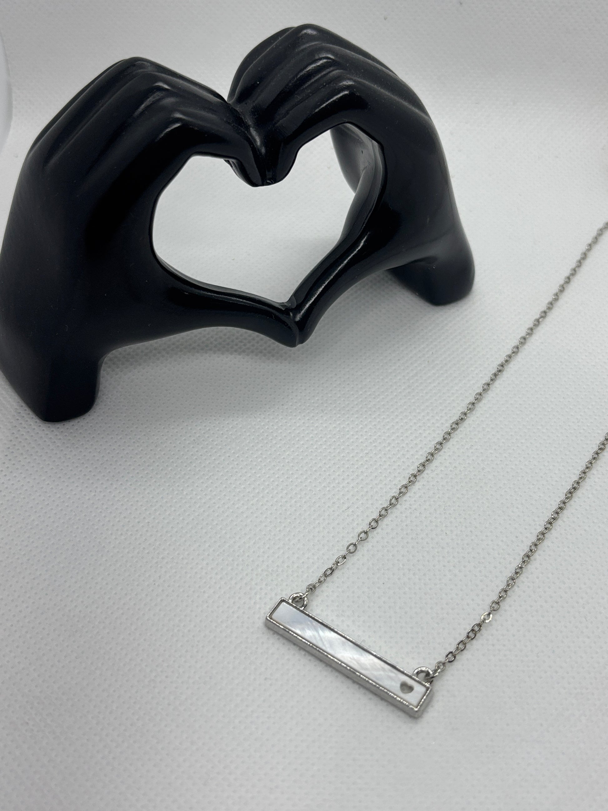 A stainless steel, silver-plated necklace, 19–21 inches in length with a 2-inch extension. It features a sleek horizontal bar pendant inlaid with mother-of-pearl, giving off a soft iridescent sheen. The bar is accented with a small metallic dot detail on one end, adding a touch of modern asymmetry to the clean design.