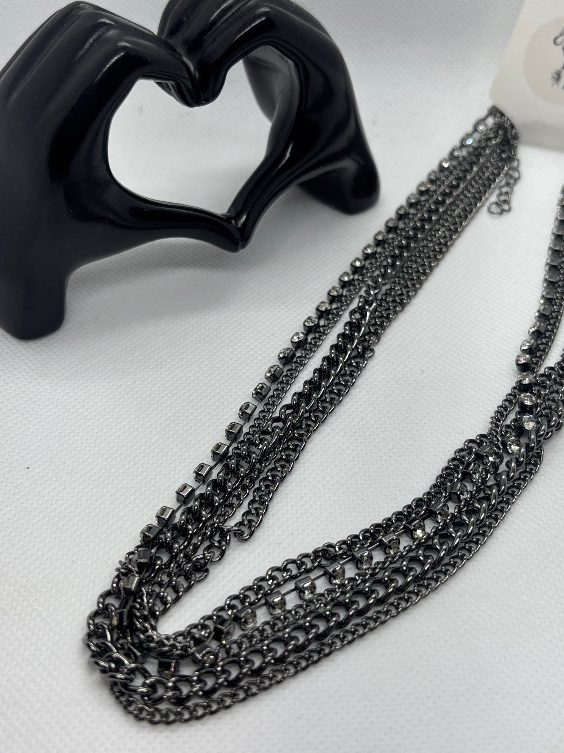 A stainless steel, gunmetal-toned necklace, 19–21 inches long with a 2-inch extension. This striking multi-strand design features a fusion of bold chains and delicate rhinestone-accented links, layered together to create rich texture and visual intrigue. The varying chain styles give it a dynamic, edgy flair while maintaining a polished finish.
