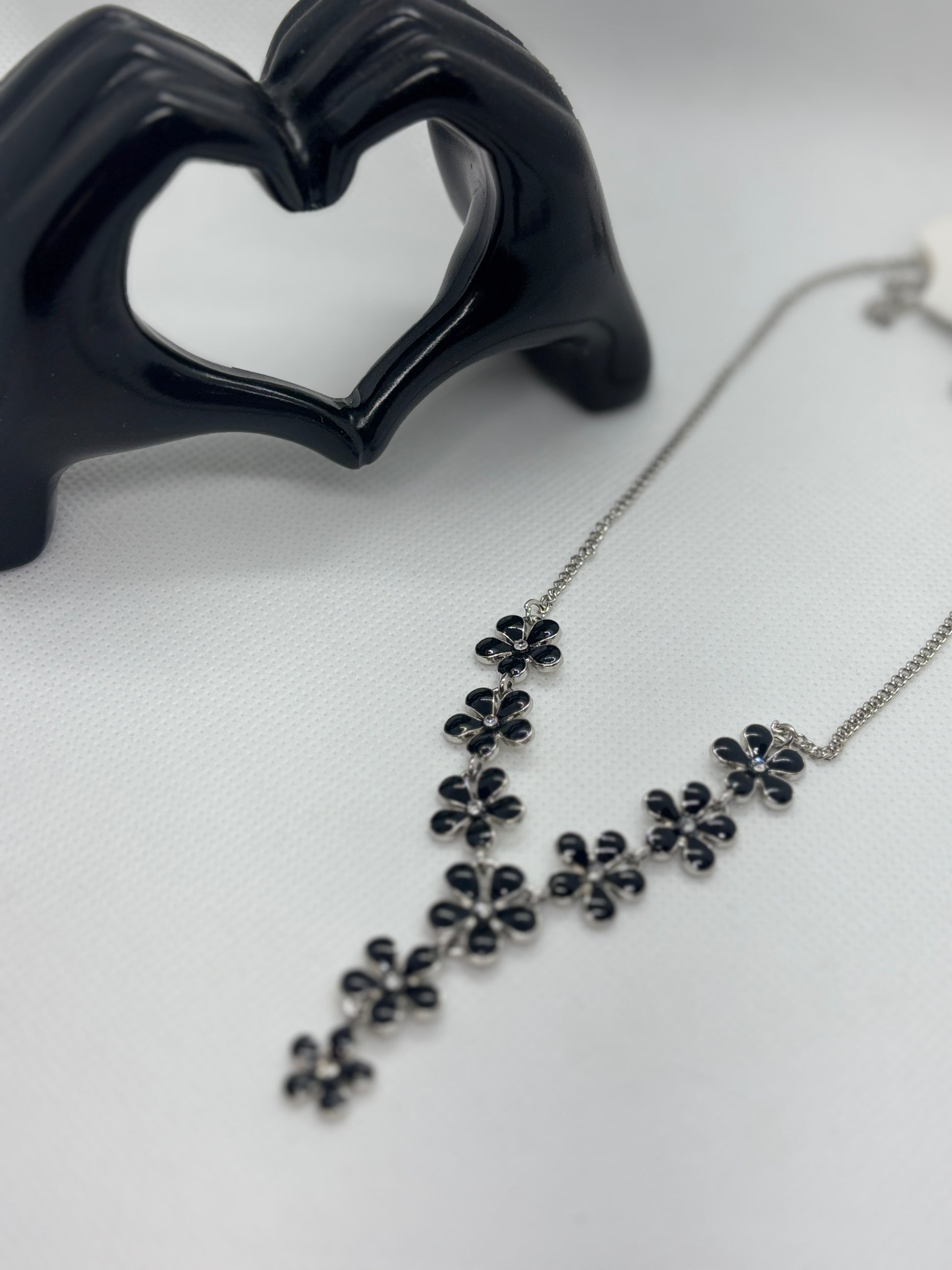A stainless steel, silver-plated necklace, 19–21 inches long with a 2-inch extension. It features a delicate chain that gives way to a striking Y-shaped cascade of black enamel daisy flowers. Each flower has five rounded petals with a subtle metallic outline and a small rhinestone center, creating a balanced blend of soft sparkle and retro-inspired charm.