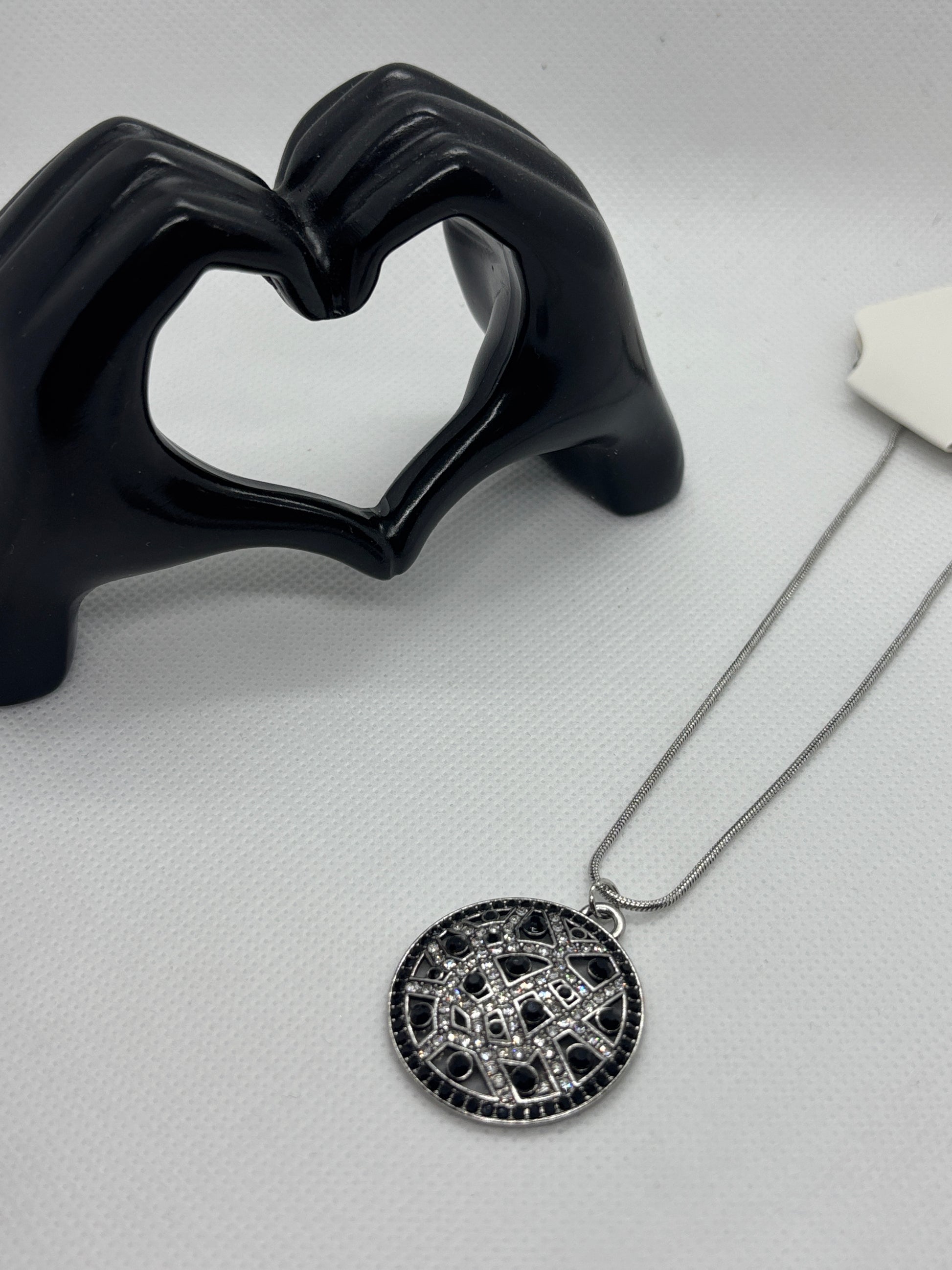 A stainless steel, silver-plated necklace, 19–21 inches in length with a 2-inch extension. It features a round medallion pendant with a detailed geometric mosaic pattern, accented by black stones and marcasite-style textures. The pendant is suspended from a sleek silver snake chain, adding to its refined and structured appeal.