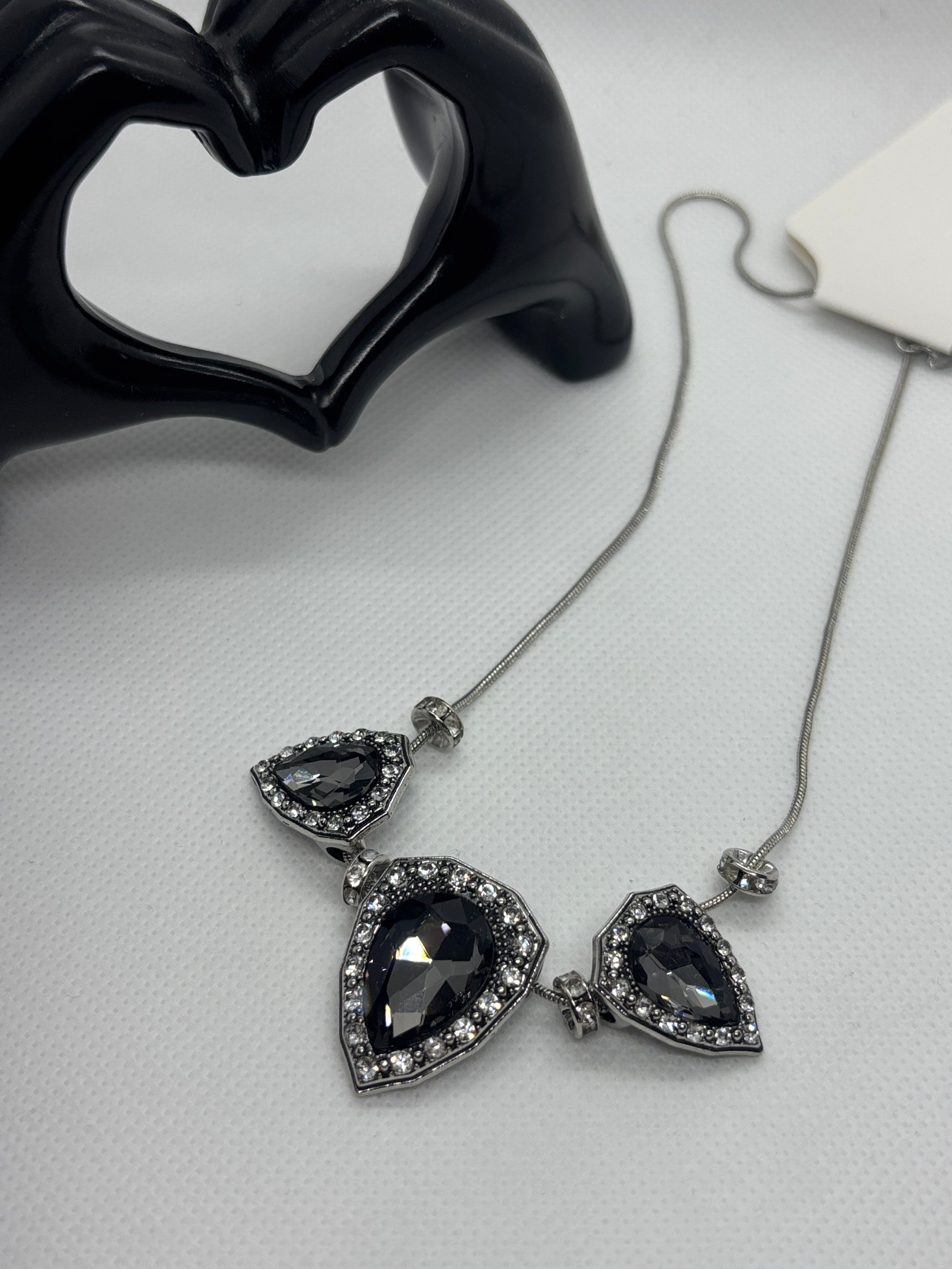 A stainless steel, silver-plated necklace measuring 19–21 inches in length with a 2-inch extension for versatile fit. The design features three faceted black teardrop crystals, each surrounded by a halo of small clear rhinestones. The central pendant is larger, flanked by two slightly smaller teardrop shapes, all suspended from a sleek silver snake chain. Small silver spacer rings with inset rhinestones separate the pendants for added sparkle and dimension.