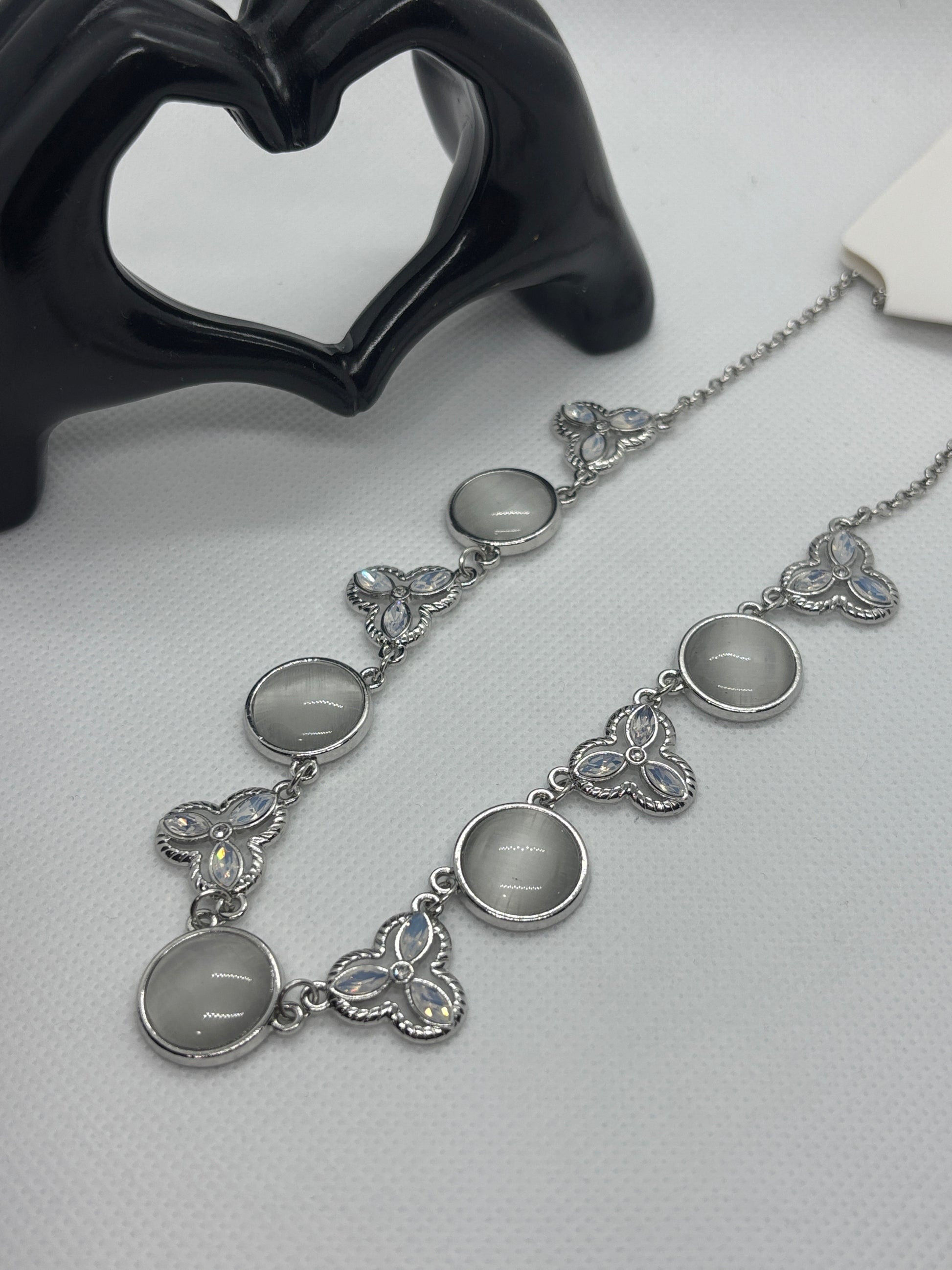 A stainless steel, silver-plated necklace measuring 19–21 inches in length and complete with a 2-inch extension. The design alternates between soft, frosted round cabochon stones and clover-like floral connectors adorned with marquise-cut iridescent crystals. Each element is set in a polished silver-tone frame with subtle texture, creating a romantic, ethereal aesthetic.