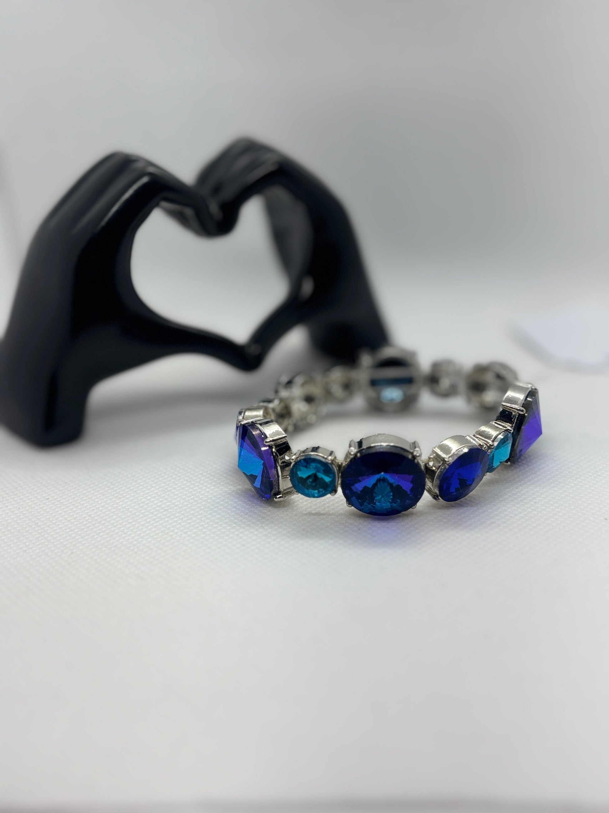 Dive into deep elegance with the Ocean Luxe Gem Bracelet, a radiant display of sapphire-inspired glamour. This stretchy bracelet features a series of faceted gemstones in bold shades of royal blue and teal, each set in sleek silver-toned settings that catch and reflect the light from every angle.
