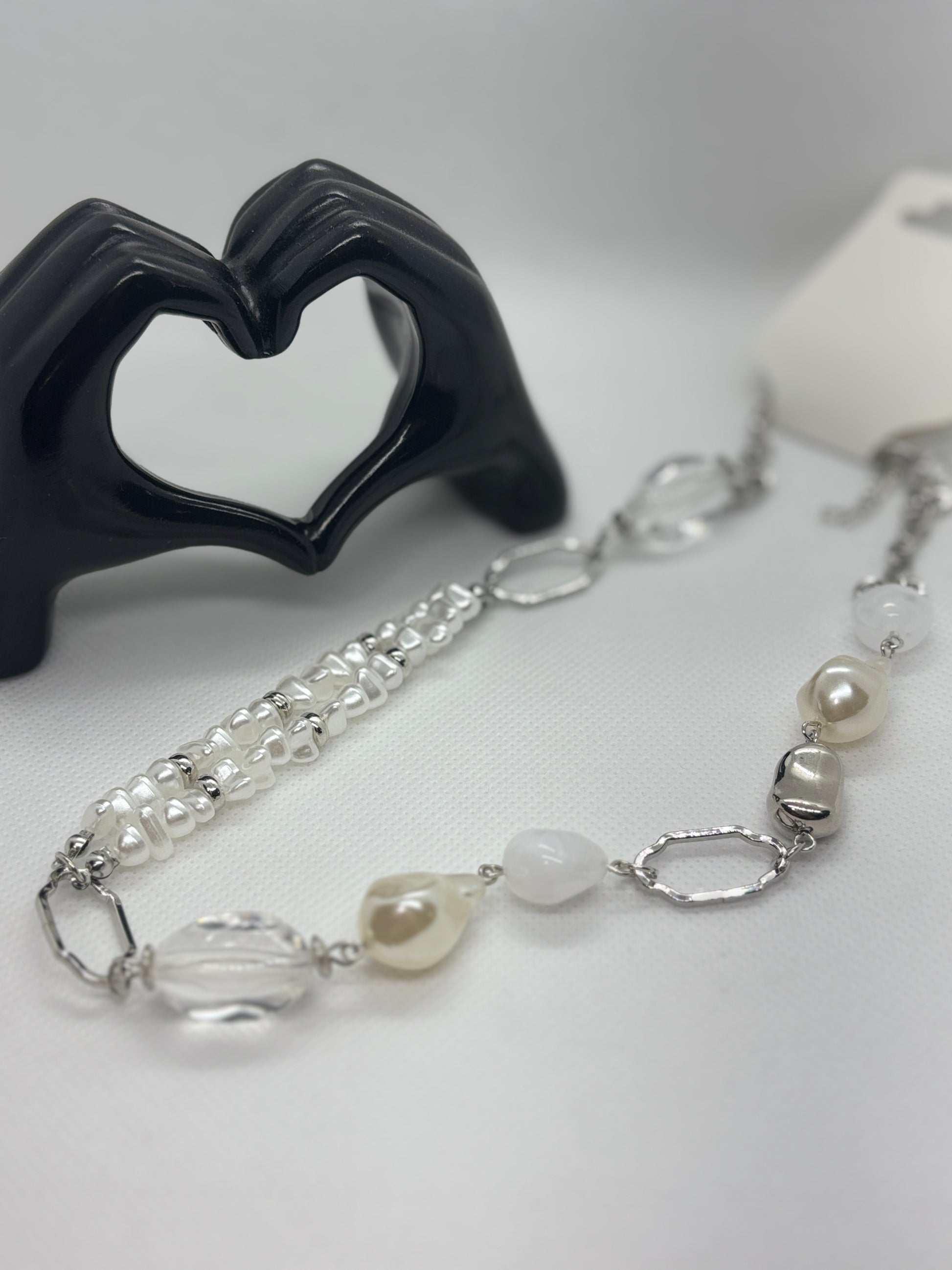 A stainless steel, silver-plated necklace measuring 19–21 inches with a 2-inch extension for adjustable length. The design features a charming combination of faux pearls, clear glass-like beads, and silver hammered links. Asymmetrical shapes and natural-looking baroque-style beads give the necklace a delicate, artisanal quality. A short strand of white seed pearls adds a layered, textural touch near the clasp.