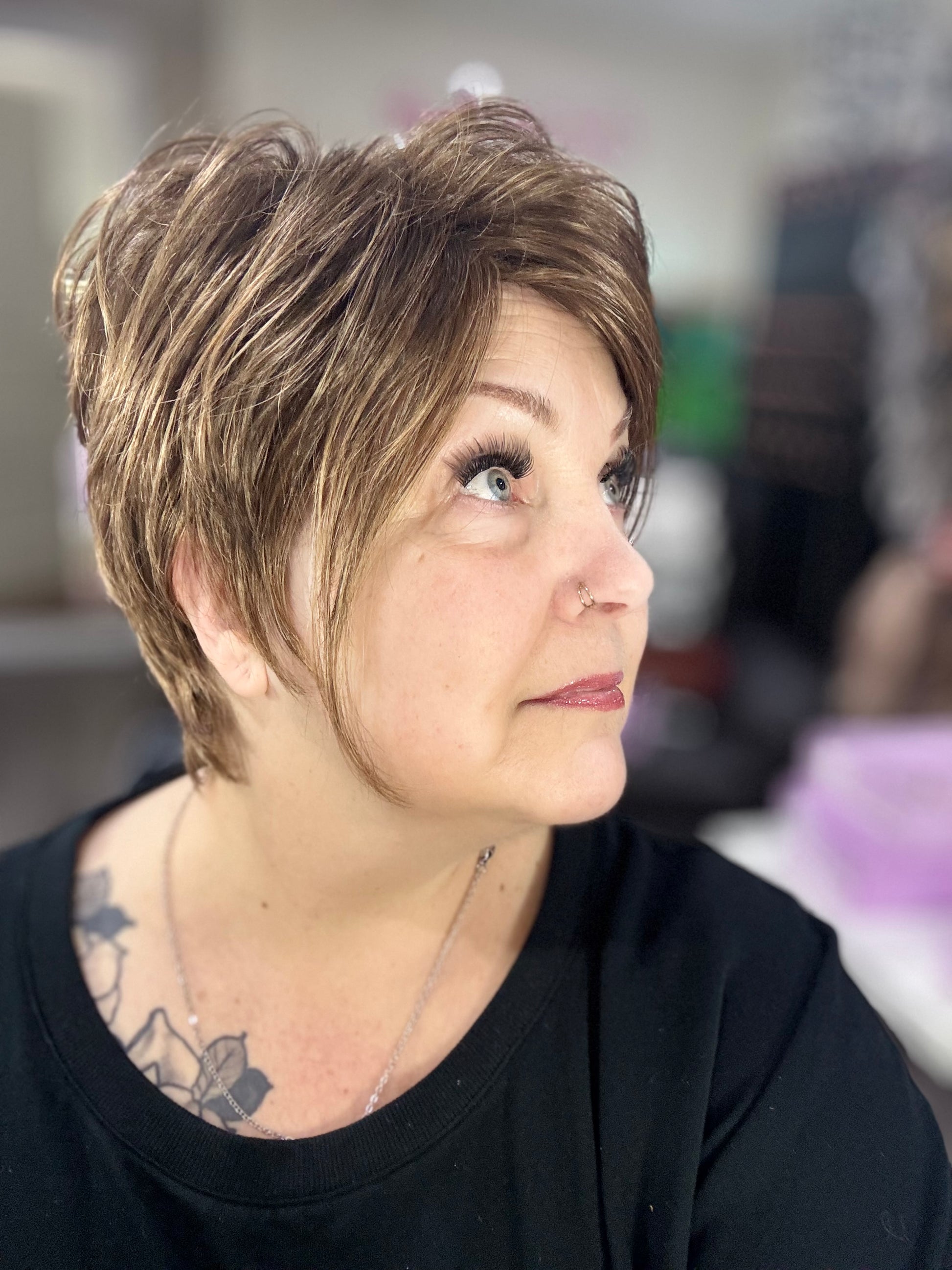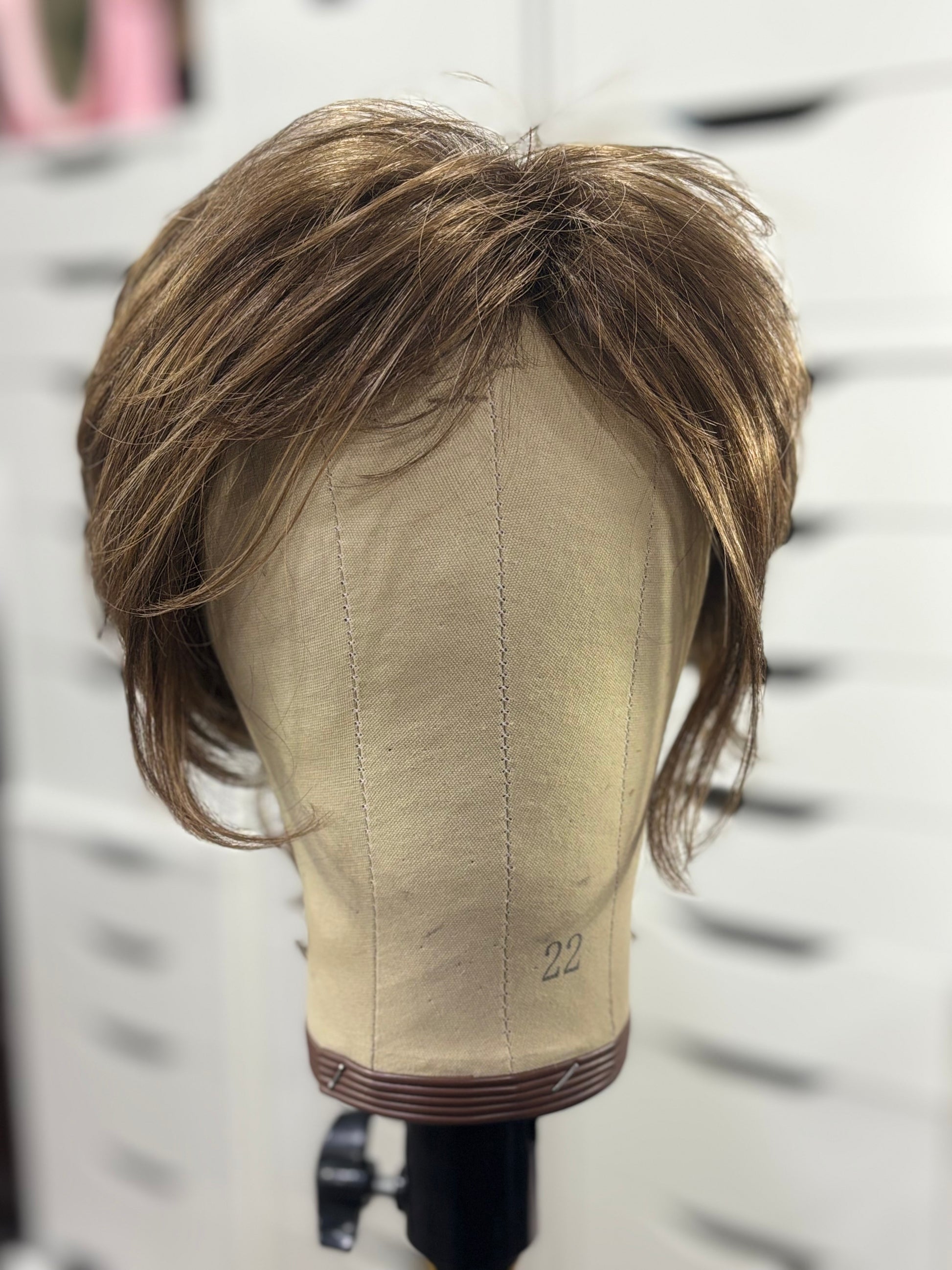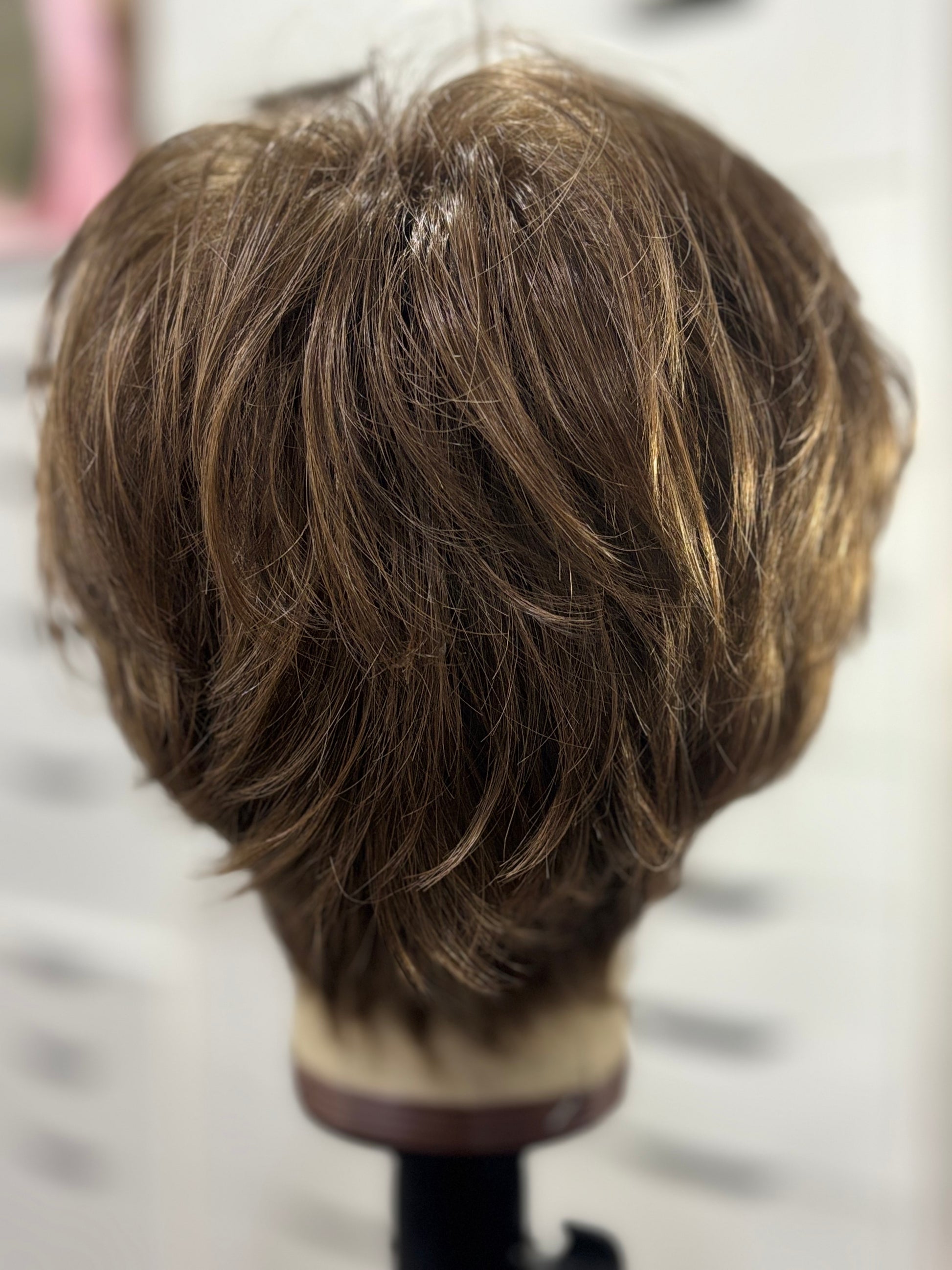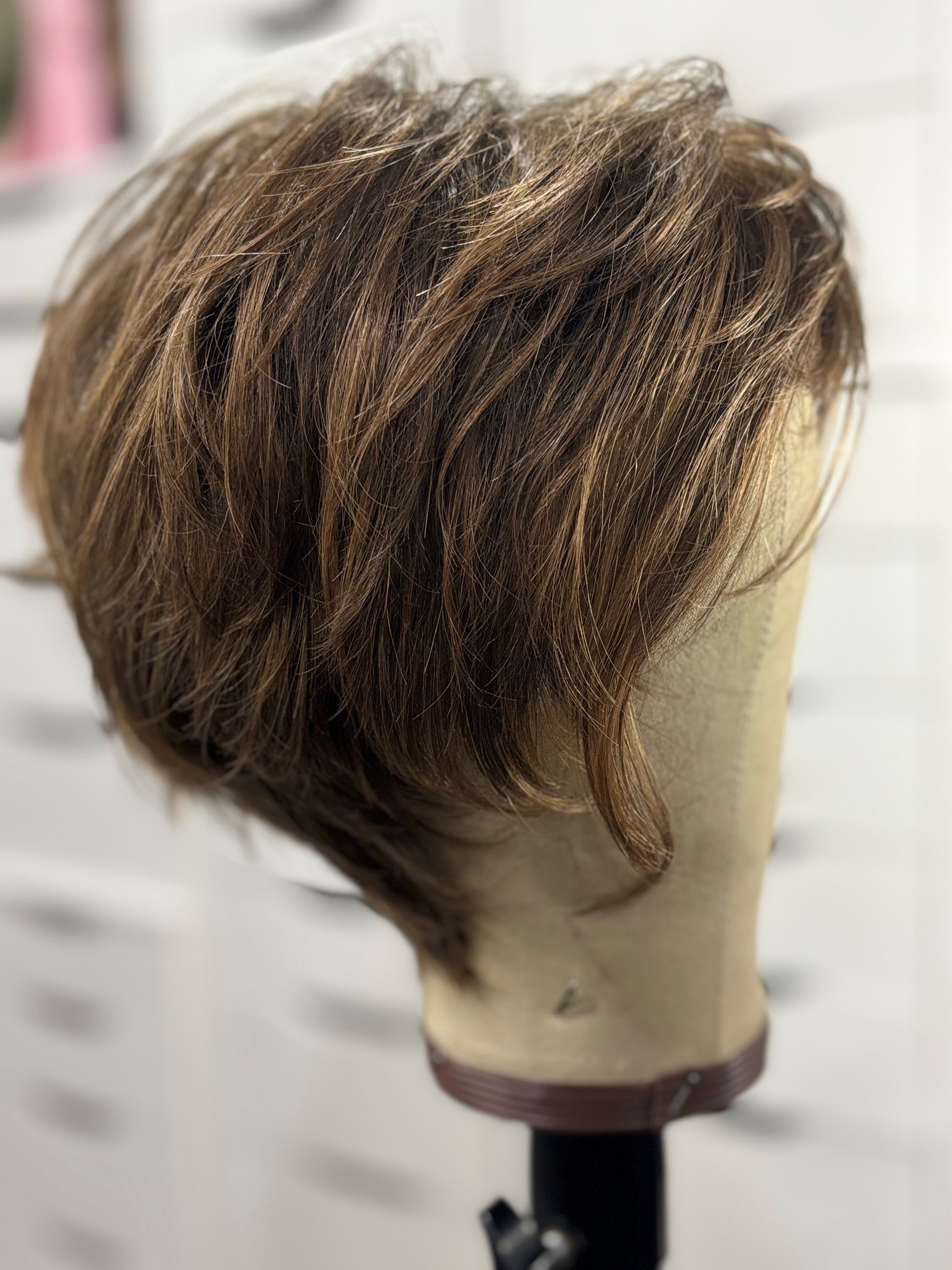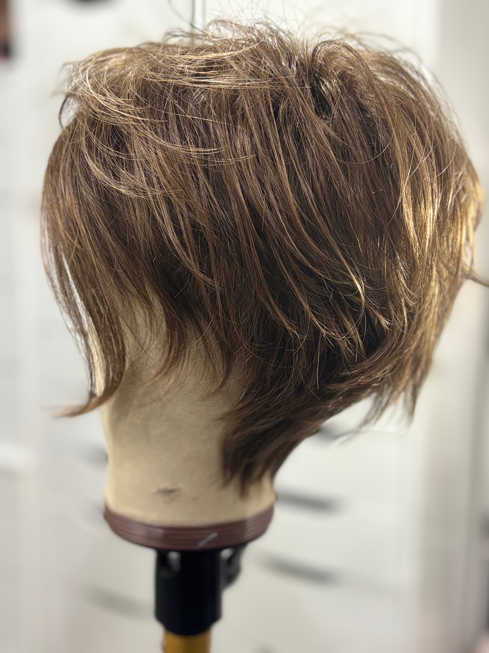 DESCRIPTION/DETAILS: Edgy, modern short wig with graduated layers and wispy bangs.