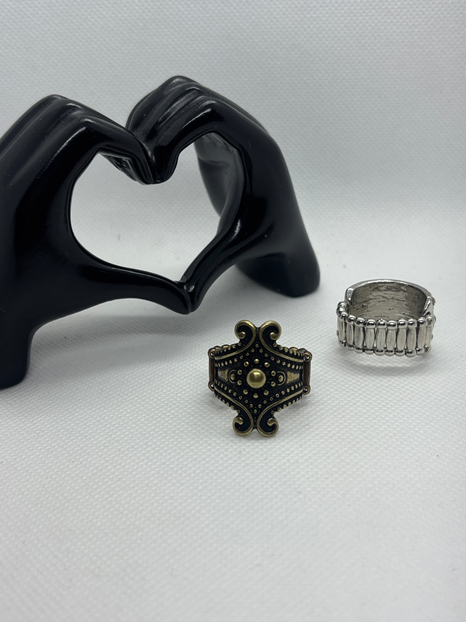 This antique-inspired ring features a bold shield-like design in brass and burnished tones, adorned with intricate dotted detailing and a raised brass centerpiece. The ornate pattern and vintage flair evoke the elegance of royal emblems and heirloom treasures.