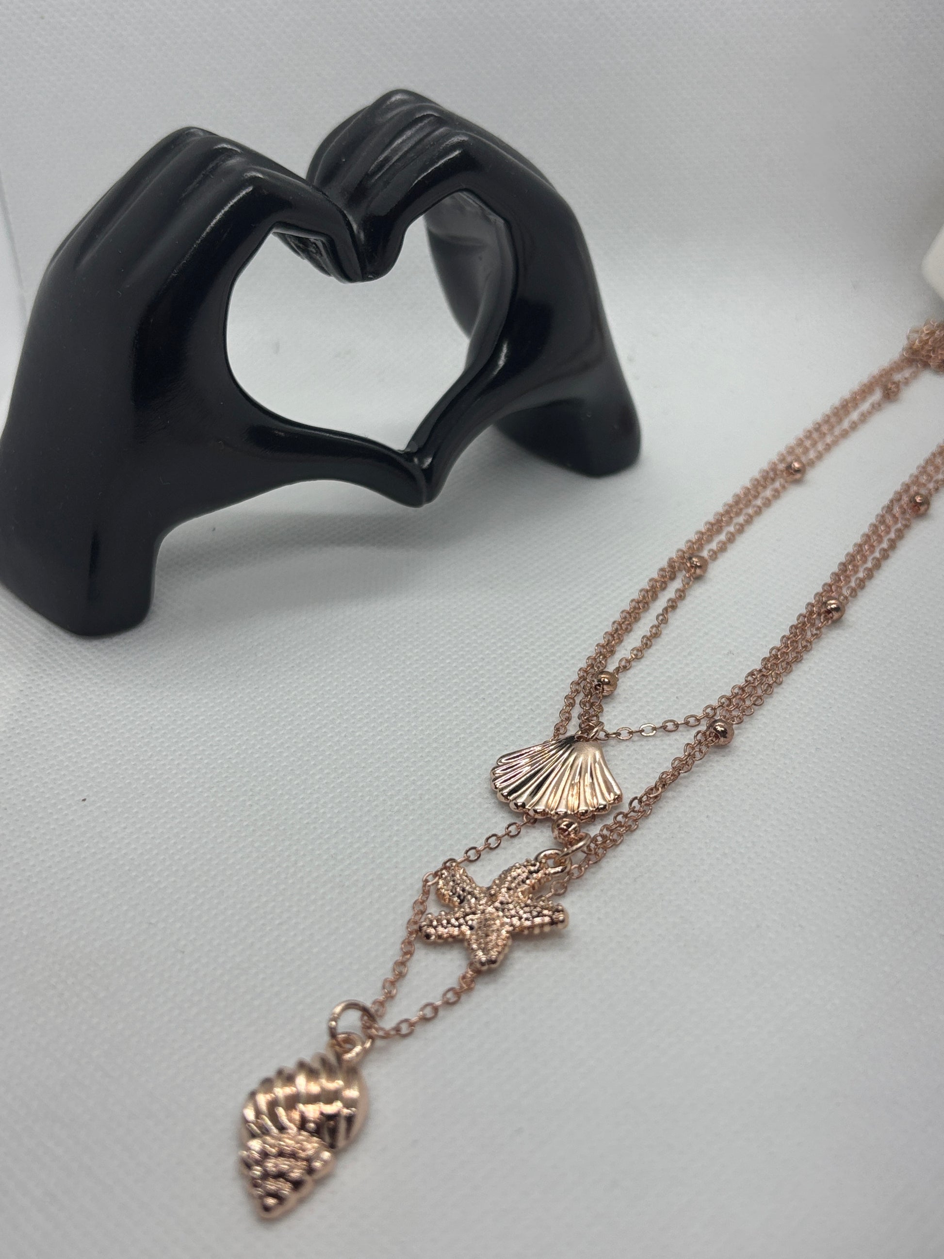 A stainless steel, rose gold-toned layered necklace, 19–21 inches long with a 2-inch extension. This charming design features three ocean-inspired pendants: a scallop shell, a textured starfish, and a detailed conch charm, each suspended from delicate rose gold chains. Small bead accents add a soft shimmer to the layered effect.