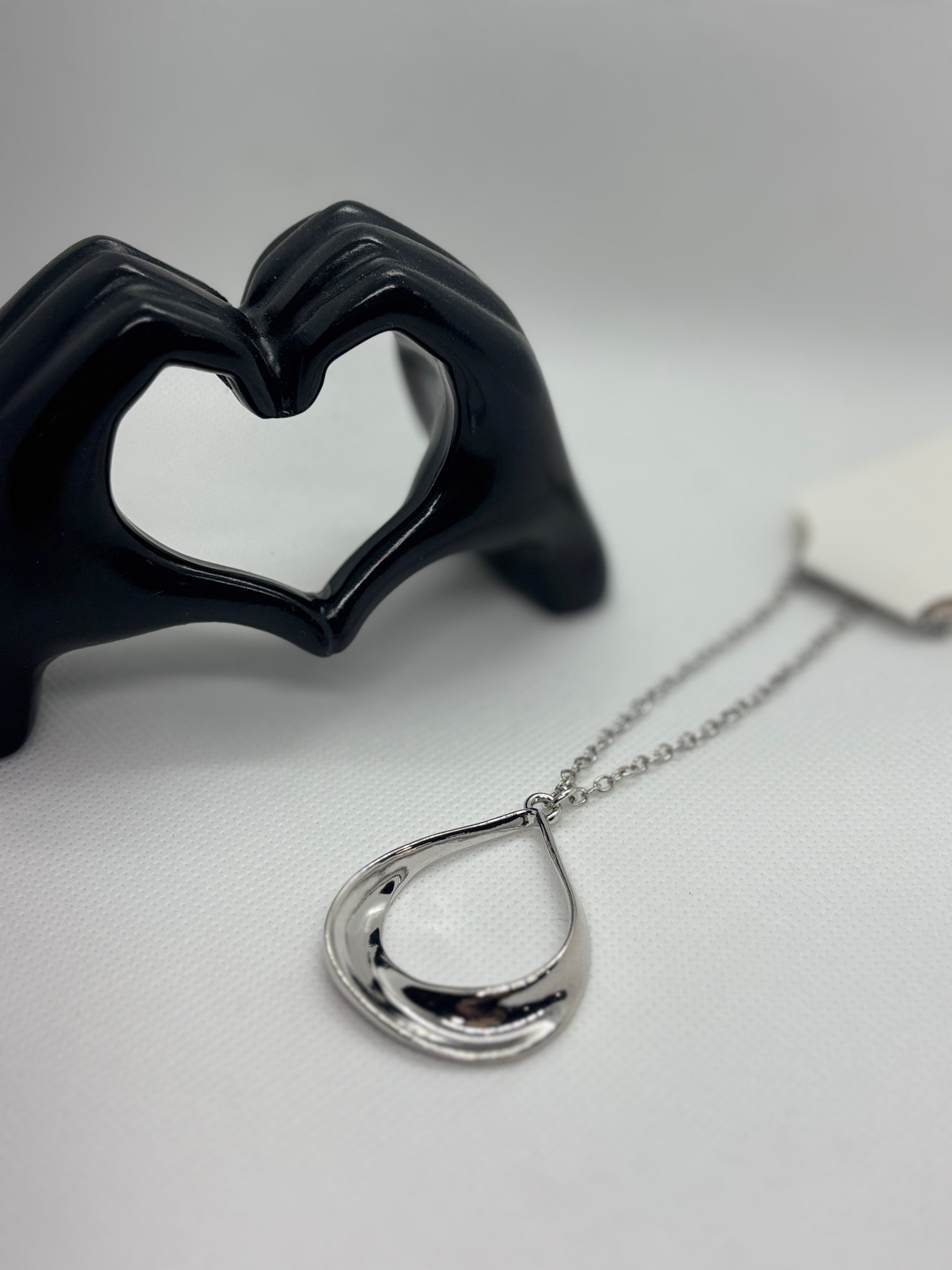 A minimalist and elegant stainless steel, silver-plated necklace featuring a smooth, modern teardrop-shaped pendant. The pendant has a slightly curved, reflective surface that gives it a fluid, sculptural look.