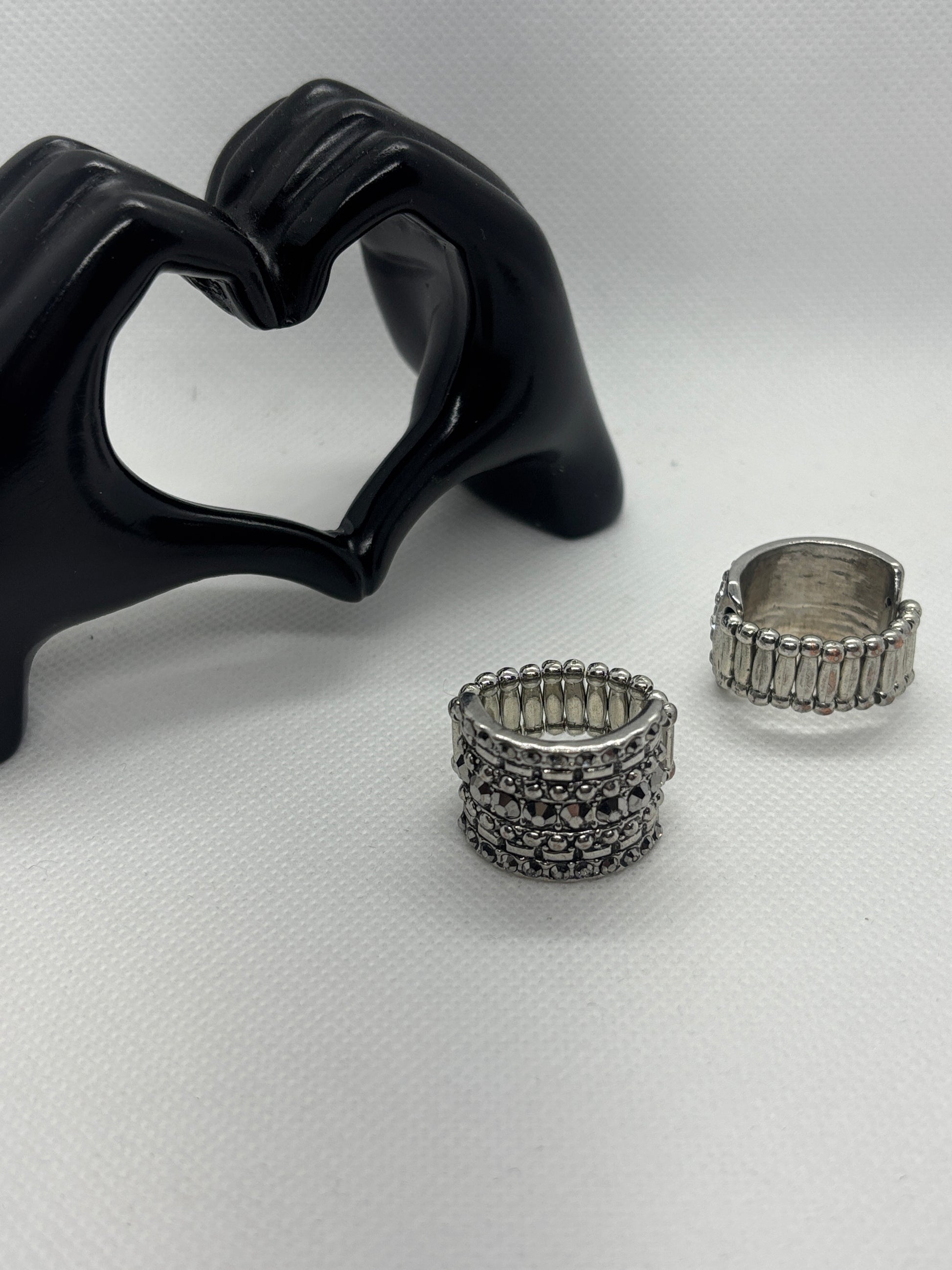 This striking silver-toned ring features three rows of textured metallic detailing, creating a bold, stacked look in one easy piece. The standout design is set on a comfortable stretchy band, allowing it to flex and fit a variety of finger sizes with ease.