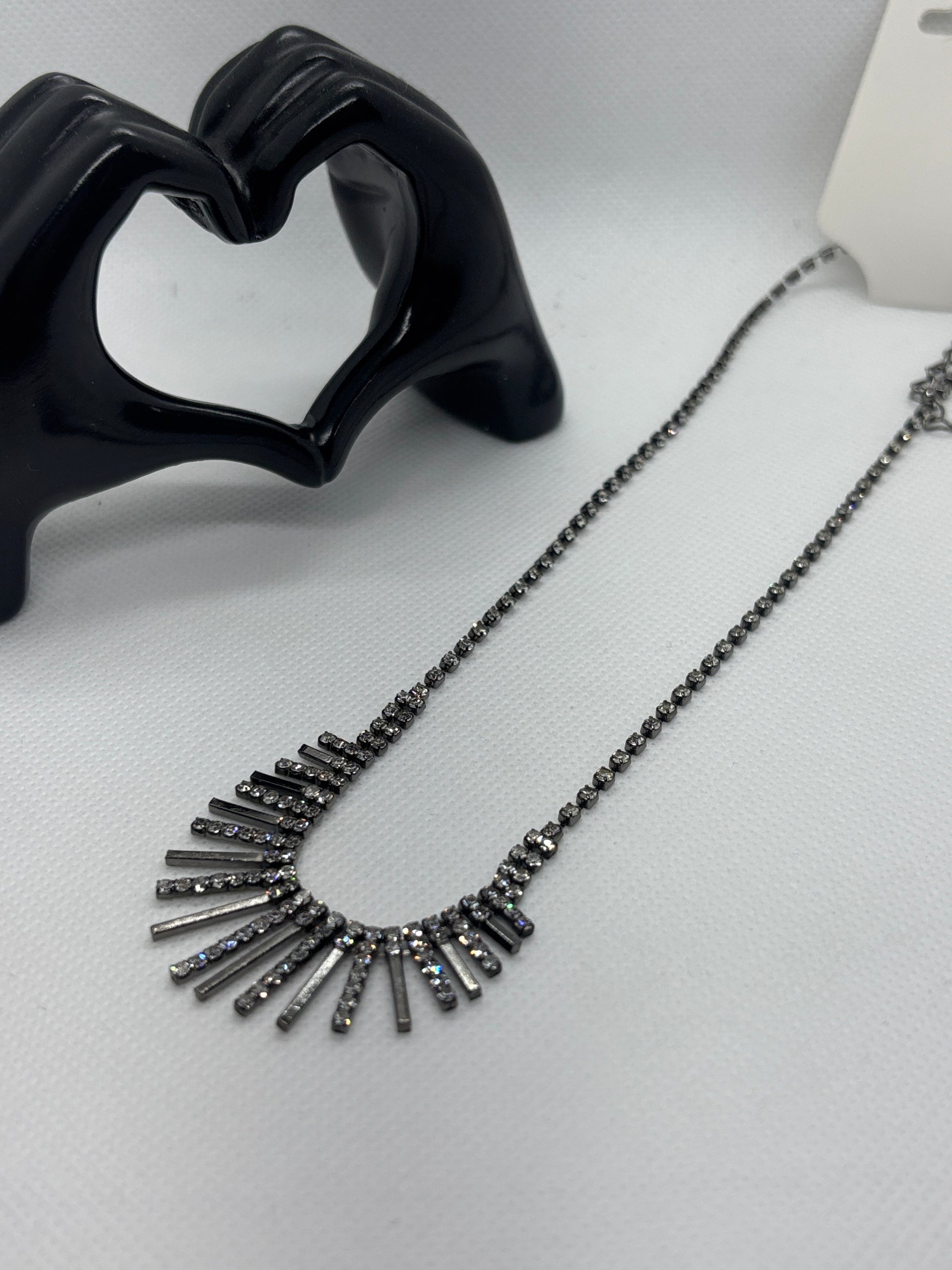 A stainless steel, gunmetal-toned necklace, 19–21 inches long with a 2-inch extension. The centerpiece features a radiant fan of vertical bars—some sleek, others adorned with clear rhinestones—arranged like a burst of light. The shimmering stones continue up the chain, adding extra brilliance to this edgy yet elegant piece.