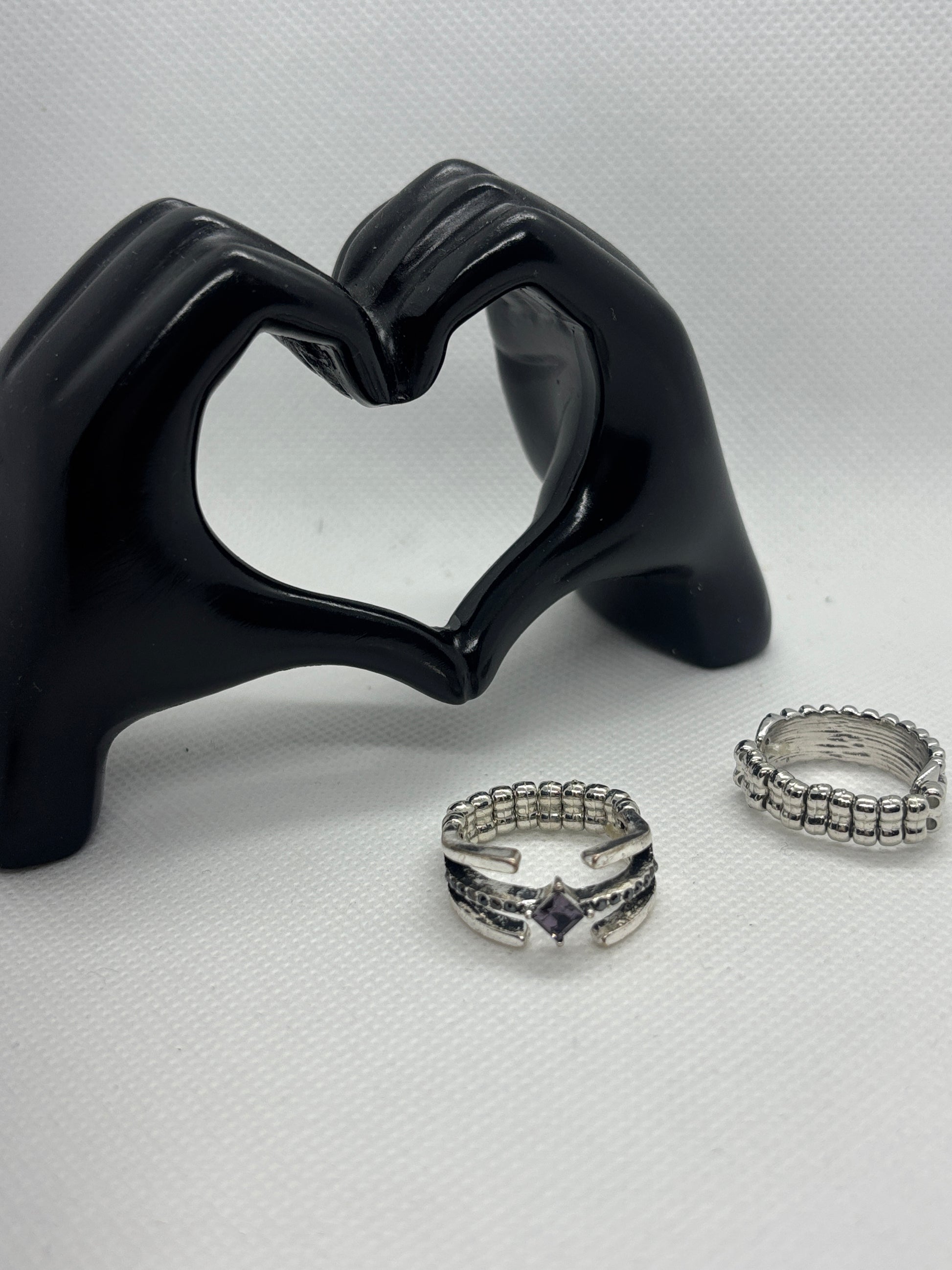 Elegant with a touch of edge, this silver-toned ring features a unique open-band design accented by layered textures and a small, square-cut lavender stone at its center. The antique-inspired detailing adds depth and charm, while the soft hint of purple brings just the right amount of color.
