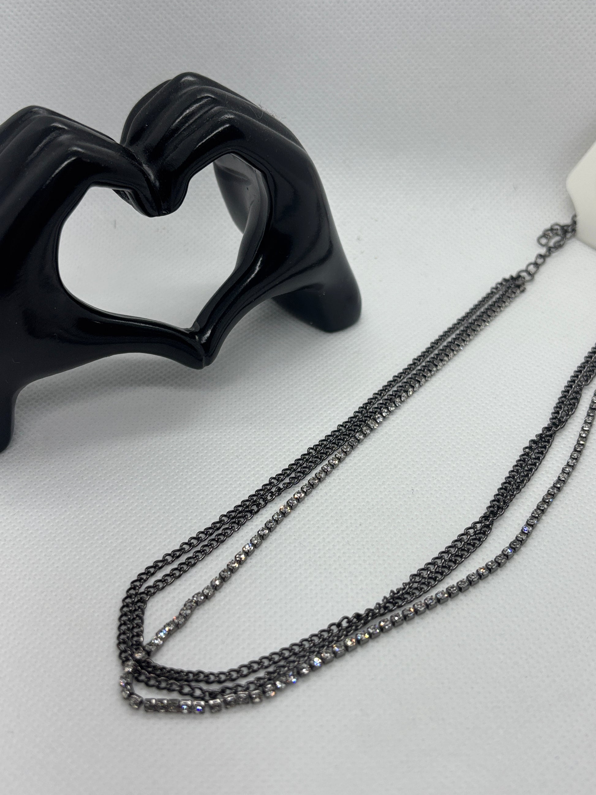 A stainless steel, gunmetal-toned necklace, 19–21 inches long with a 2-inch extension. This elegant design features a trio of delicate chains—two classic links paired with one shimmering rhinestone strand. The soft contrast between the dark metal and the light-catching crystals creates a refined balance of edge and elegance.