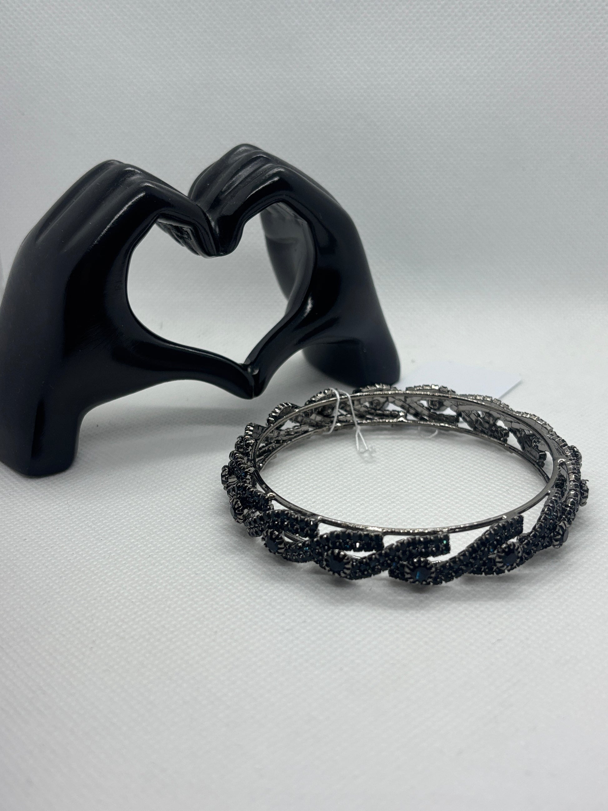 Bold meets elegant in the Twilight Twist Bangle, a stunning piece that channels mysterious glam. This sleek gunmetal-toned bracelet features a twisted vine design encrusted with deep black rhinestones, creating texture and sparkle with every movement. Its slip-on style makes it effortless to wear, while its striking contrast and layered appearance bring an edgy sophistication to any outfit.