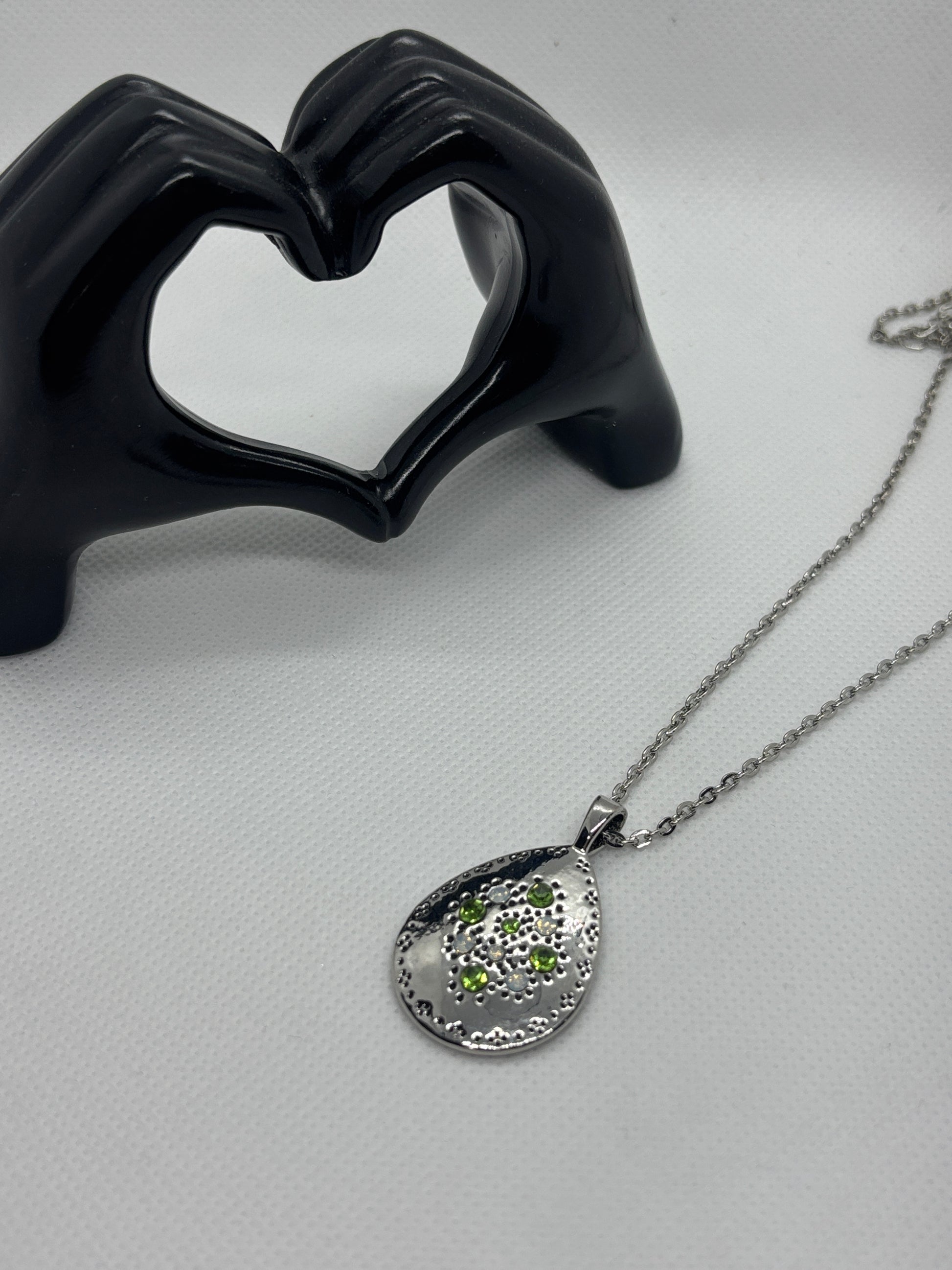 A stainless steel, silver-plated necklace, 19–21 inches in length with a 2-inch extension. The centerpiece is a textured teardrop pendant with a hammered, artisan-style surface. Scattered across the surface are small green rhinestones, resembling dewdrops or sprouting leaves, adding a natural, botanical flair.