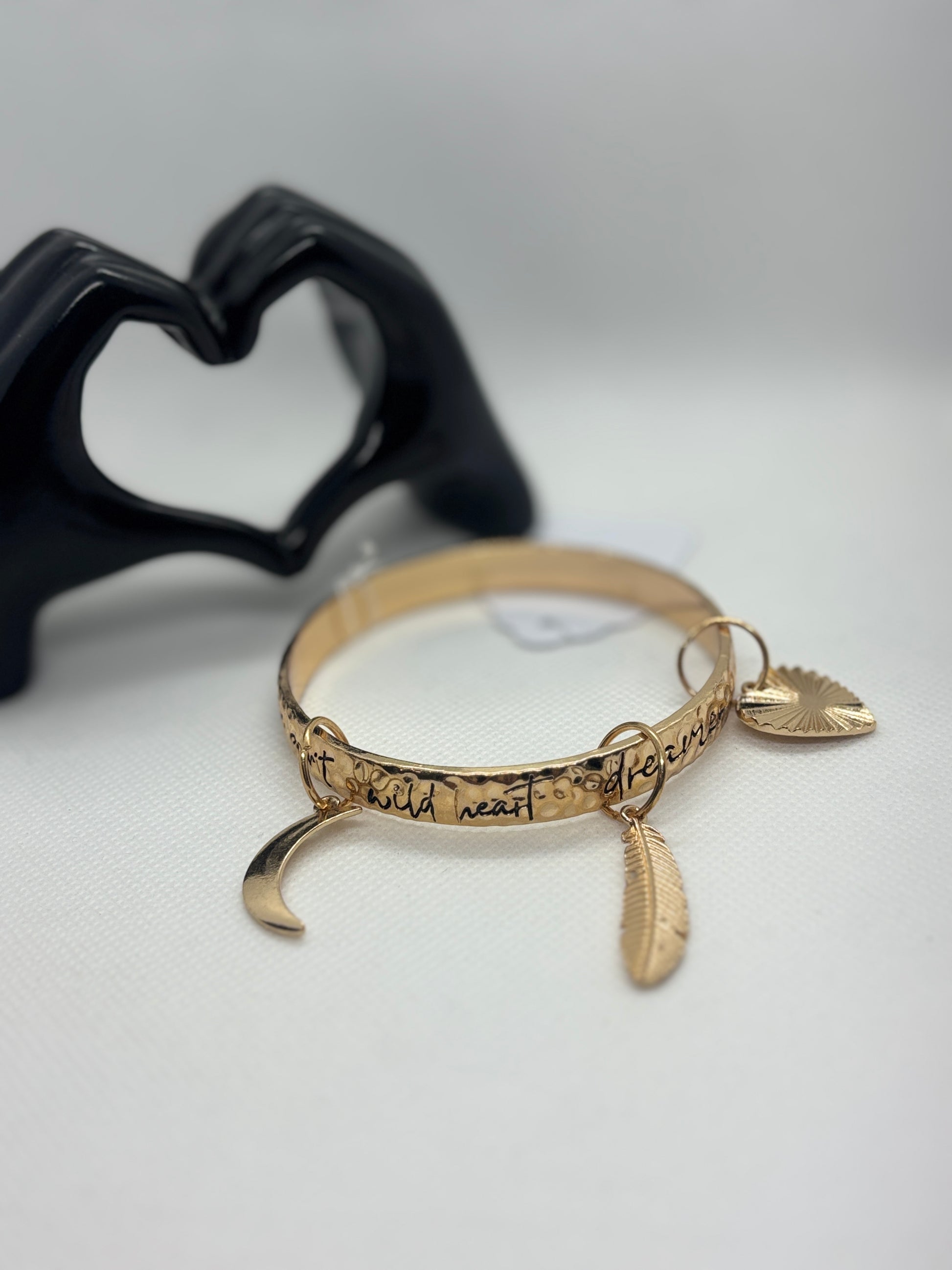 Unleash your inner free spirit with the Wander Spirit Charm Bangle, a gold-tone bracelet etched with the inspirational phrase “wild heart, dreamer soul.” The hammered finish adds a rustic, handcrafted feel, while the trio of whimsical charms—a crescent moon, feather, and textured leaf—sway with every move, symbolizing intuition, freedom, and growth.