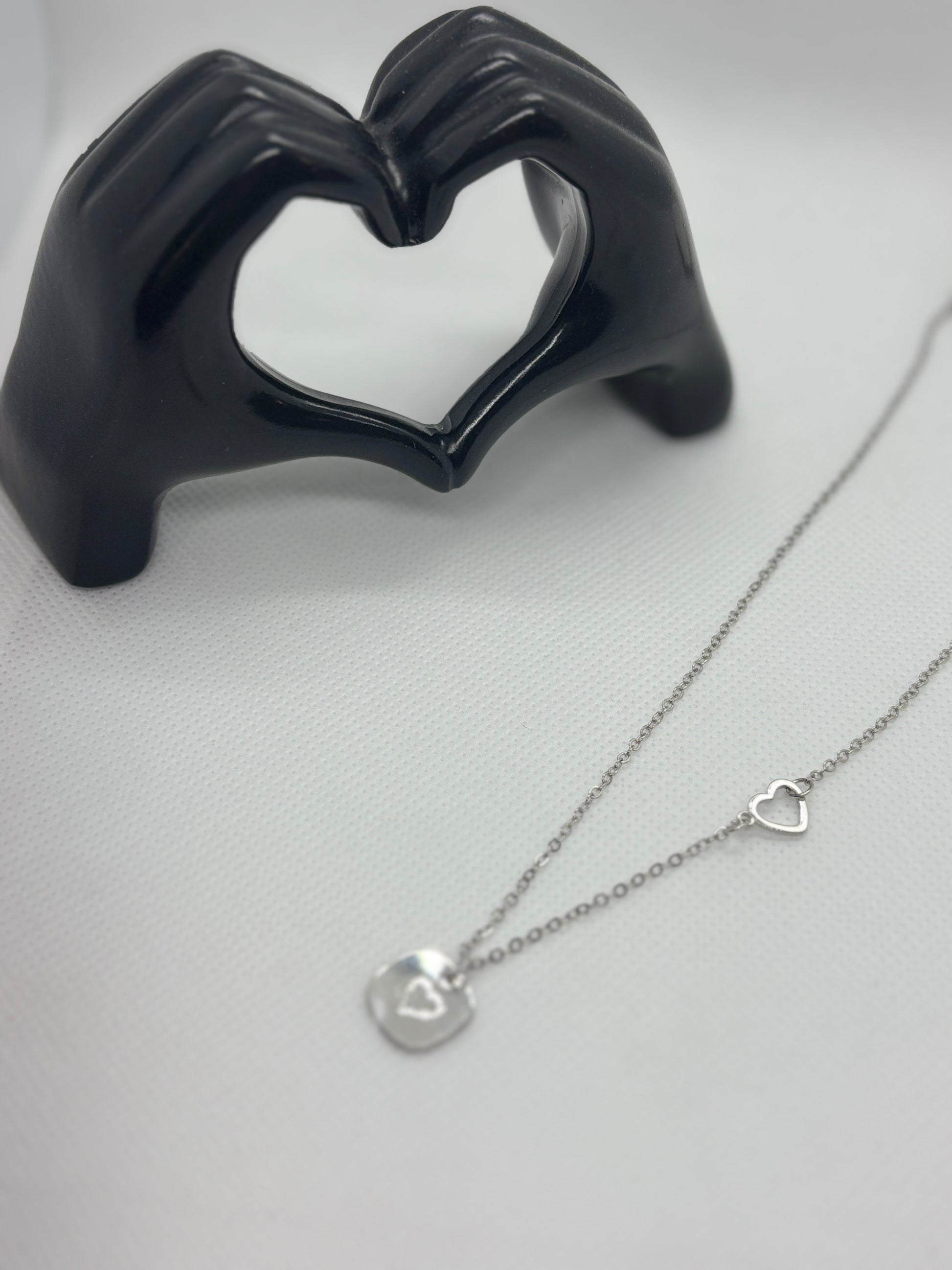 A stainless steel, silver-plated necklace, 19–21 inches long with a 2-inch extension. It features a minimalist pendant—a gently hammered disc with a delicately etched heart outline—paired with an open-cut heart charm along the chain. The asymmetrical design adds a modern twist to this subtle, heartfelt piece.